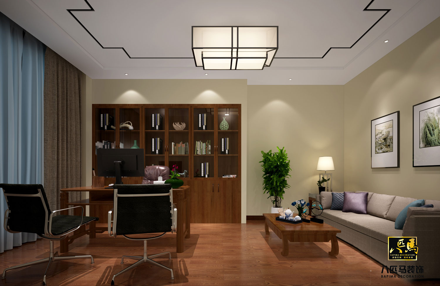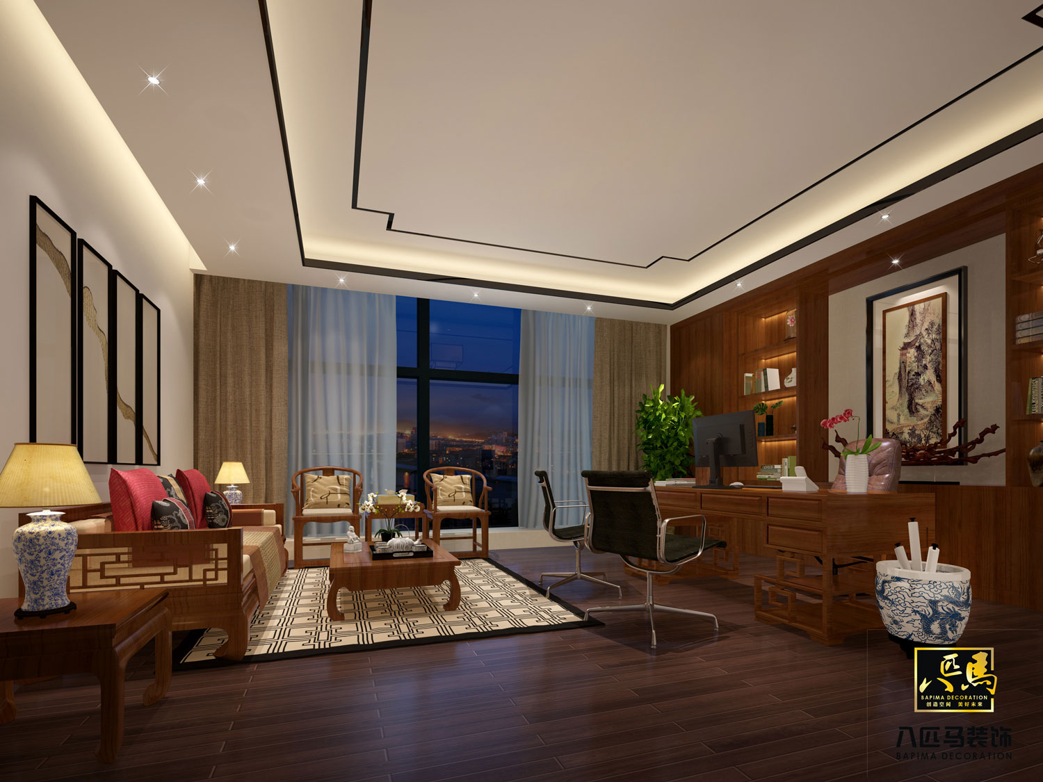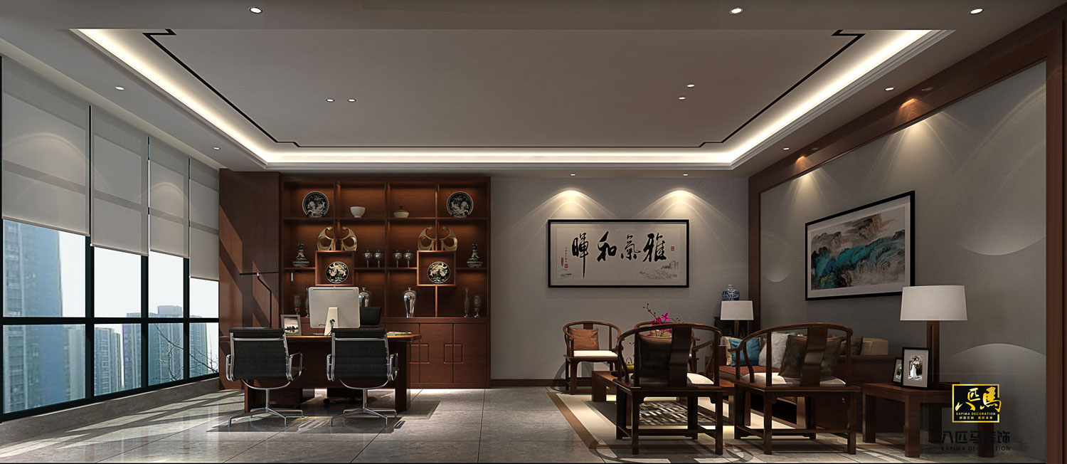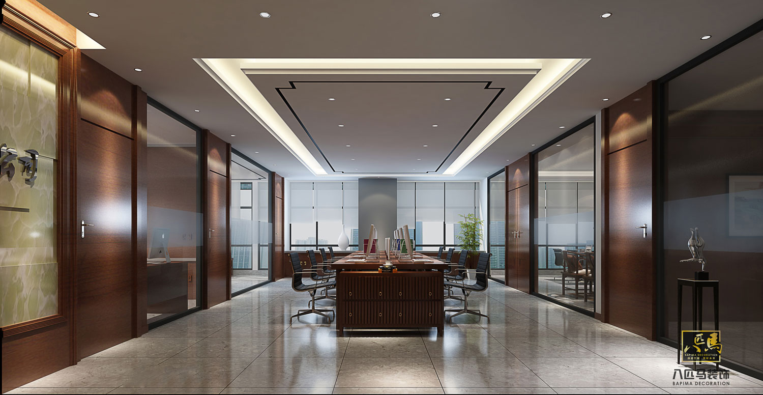 設(shè)計風(fēng)格:該司的辦公室設(shè)計風(fēng)格為新中式風(fēng)格,運(yùn)用大理石、木飾面、金屬線條及實木地板等中式元素加上現(xiàn)代元素的設(shè)計理念,時尚不失典雅,開放辦公區(qū)采用裸頂方式,提高空間層高,讓空間更通透更舒適。