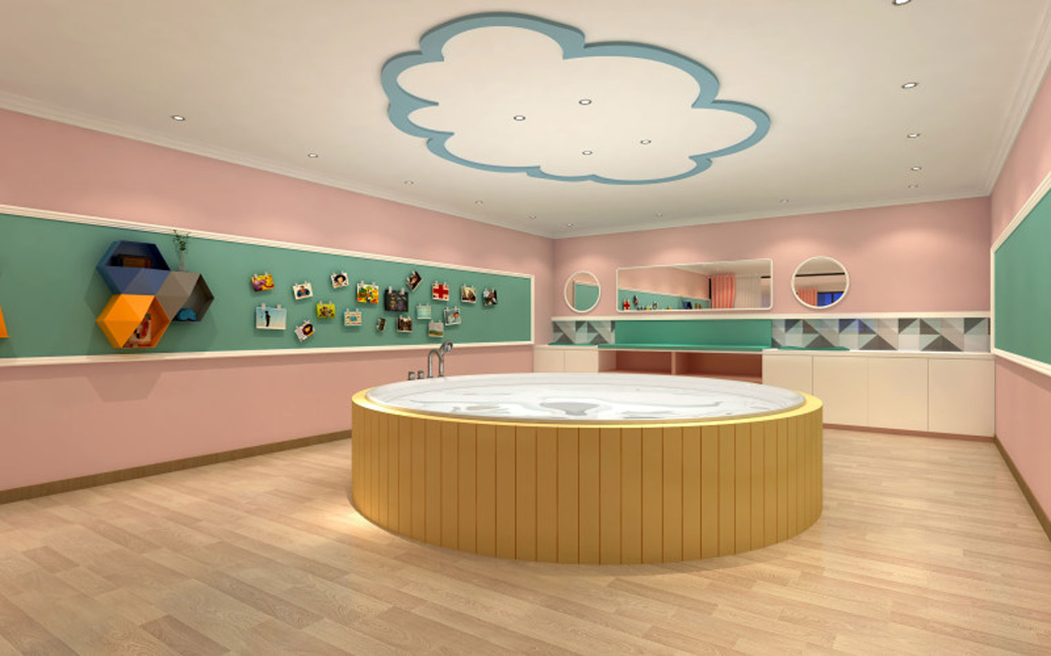 設(shè)計風格:設(shè)計師采用客戶固有的設(shè)計元素與VI進行聯(lián)想創(chuàng)作,以簡潔大方的方式展現(xiàn)現(xiàn)代簡約而高檔的早教設(shè)計,通過不同房間的不同色彩進行刺激孩子的視覺感官,從而達到歡悅而活躍的教育氛圍