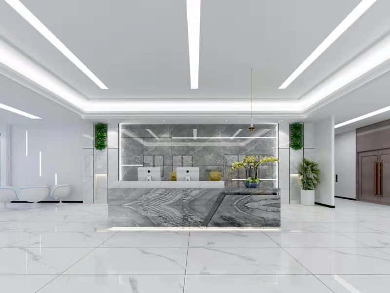 前臺(tái)區(qū)域,以白色為主調(diào),大理石材質(zhì)的前臺(tái)搭配簡(jiǎn)潔的線條燈,營(yíng)造出簡(jiǎn)潔大氣的氛圍,綠植點(diǎn)綴增添生機(jī)。