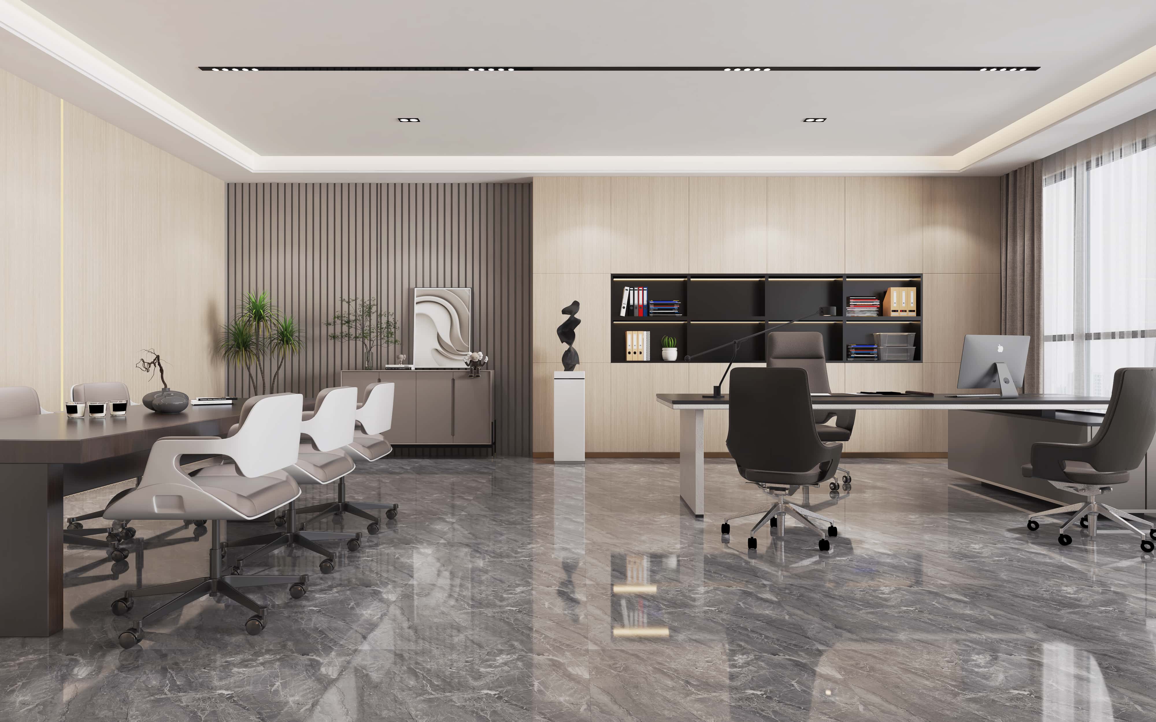 經(jīng)理辦公室,淺木色墻板營造溫馨氛圍,大面積落地窗采光良好,辦公與休閑區(qū)布局合理,家具搭配協(xié)調(diào),藝術(shù)擺件提升格調(diào)。