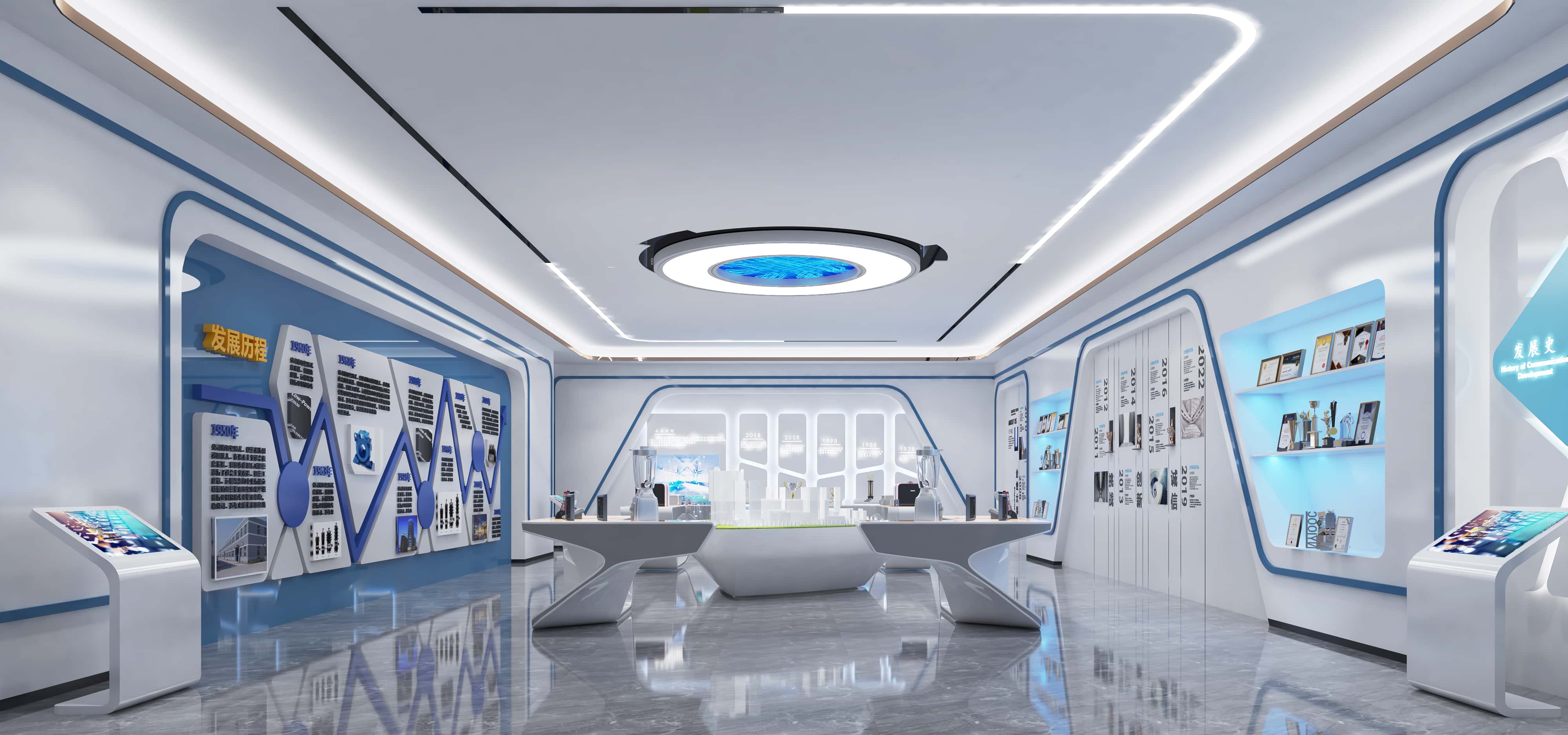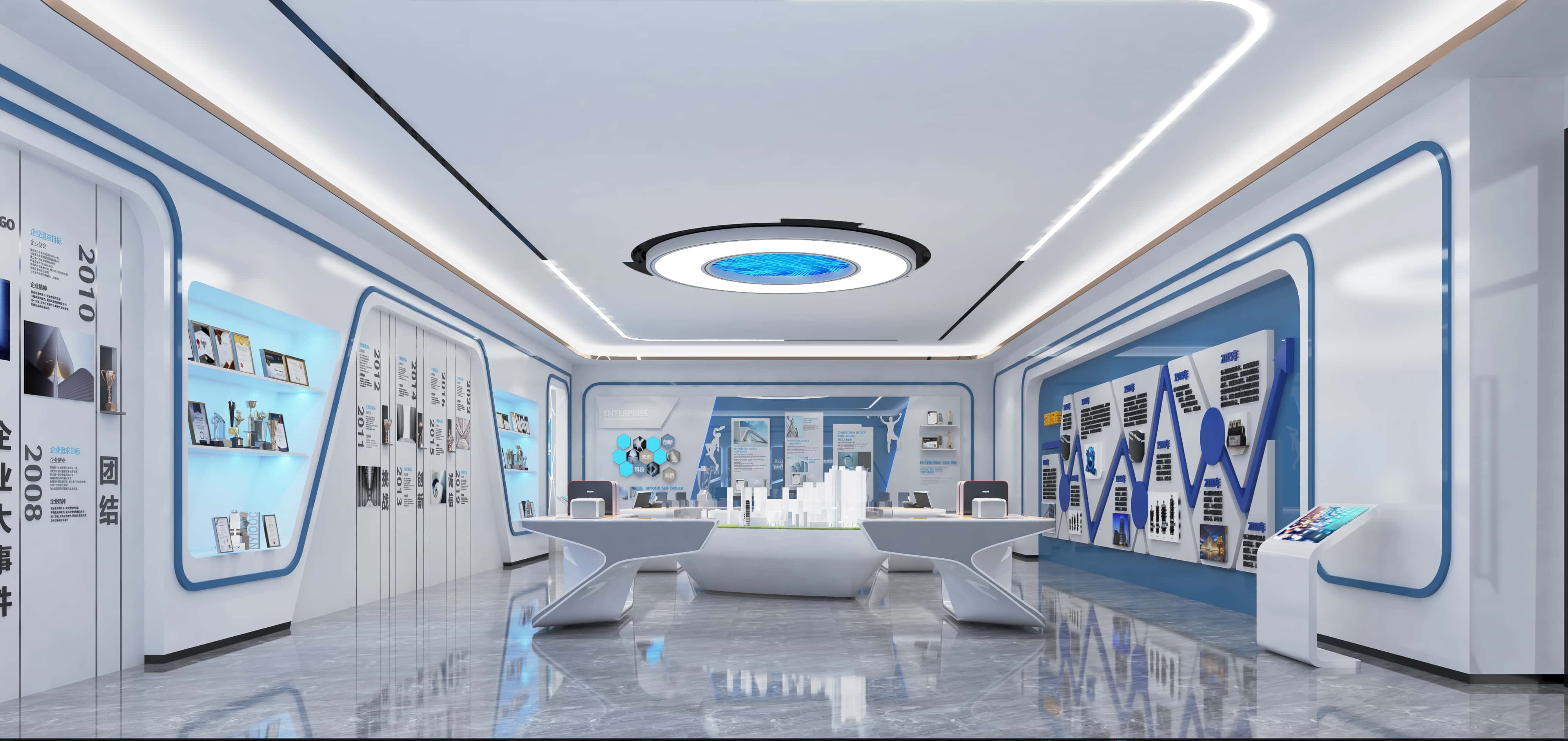 展廳區(qū)域,藍白配色凸顯科技感,弧形墻面結(jié)合燈帶,造型獨特。展示墻系統(tǒng)呈現(xiàn)企業(yè)歷程與榮譽,多媒體設(shè)備增強互動,展示臺設(shè)計新穎,燈光烘托氛圍,打造出一個集展示與體驗于一體的現(xiàn)代空間。