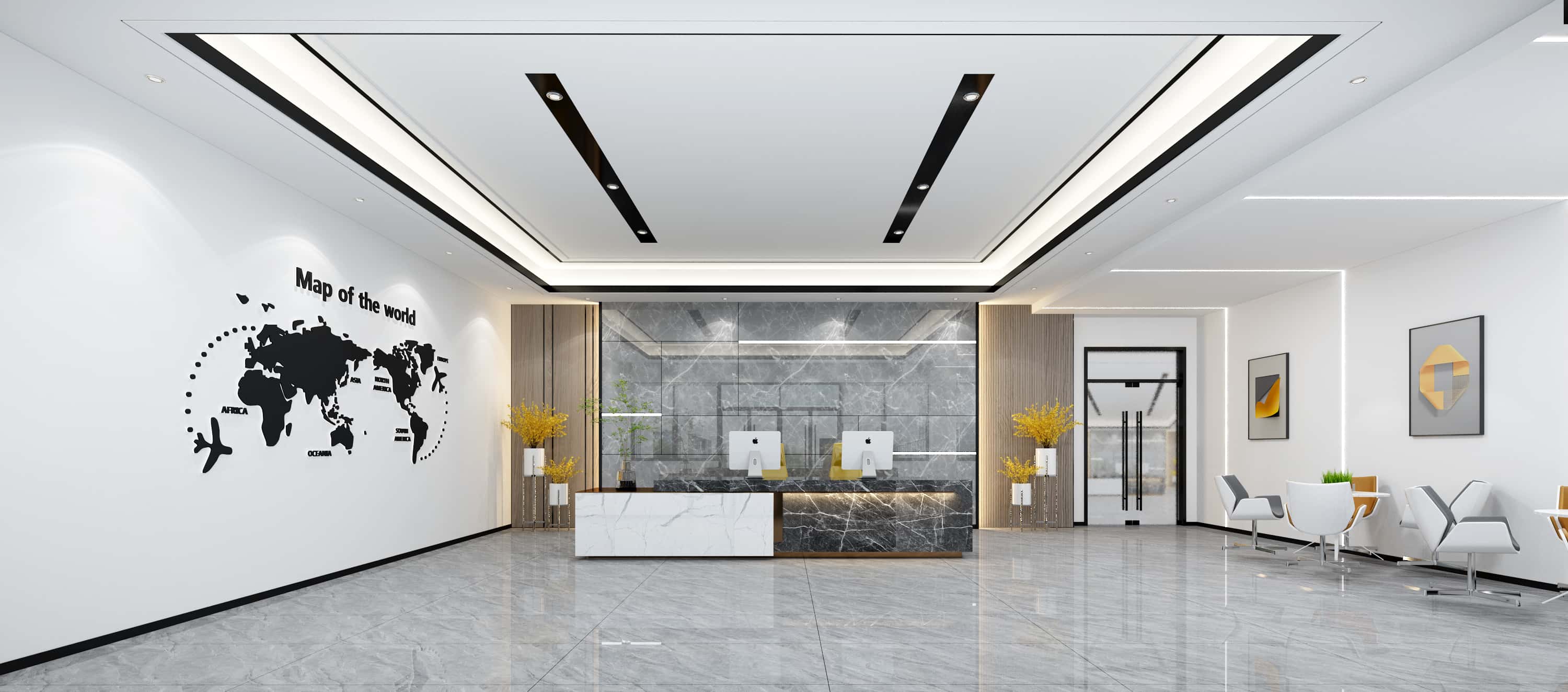 前臺(tái)區(qū)域,以白色為主調(diào),搭配世界地圖墻貼,彰顯國(guó)際化視野,大理石前臺(tái)與木質(zhì)元素結(jié)合,增添質(zhì)感與溫馨。