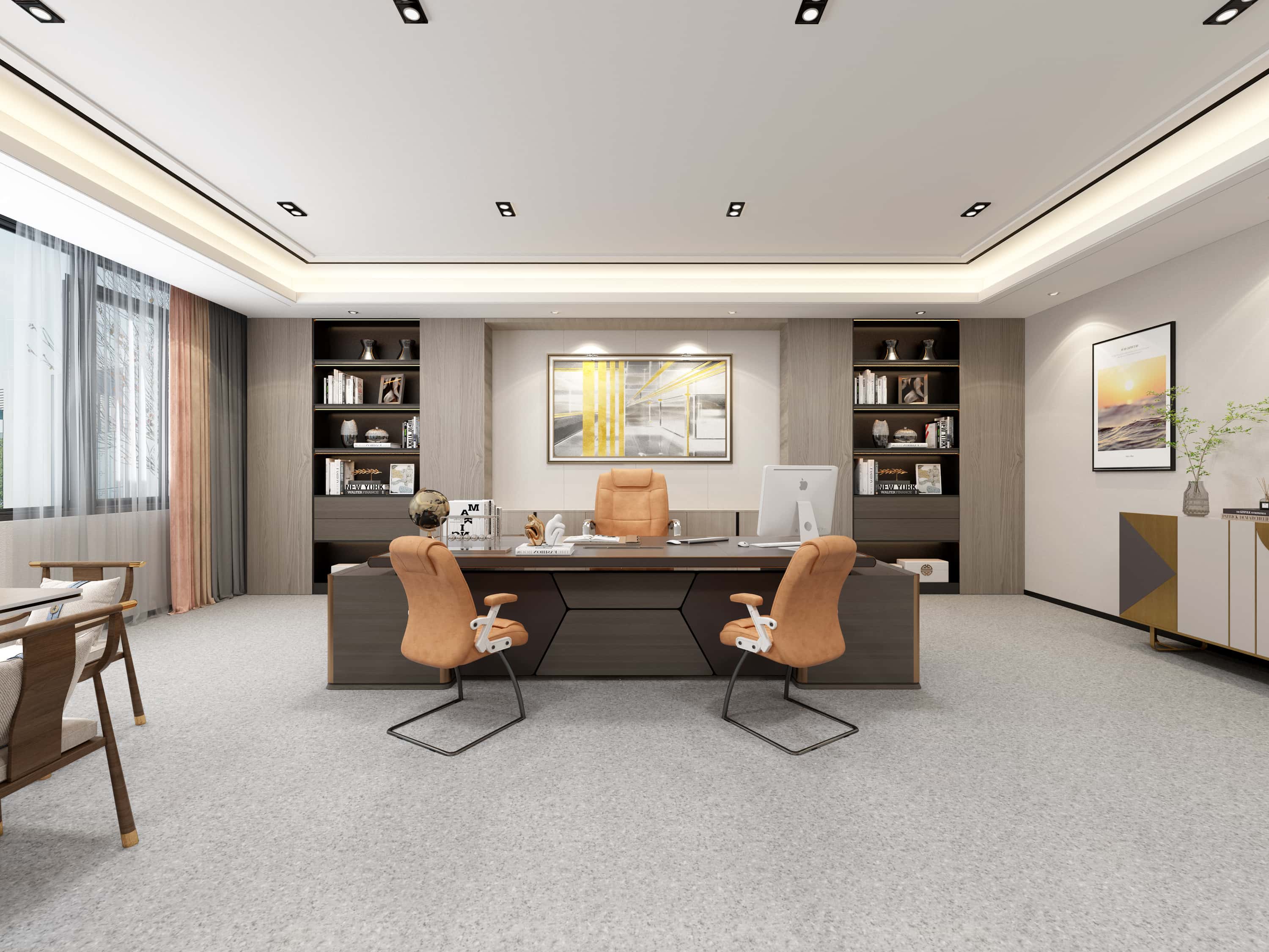 經(jīng)理辦公室,布局合理,辦公桌椅與書架搭配協(xié)調(diào),裝飾畫與綠植點(diǎn)綴其間,營(yíng)造出專業(yè)且舒適的辦公環(huán)境。