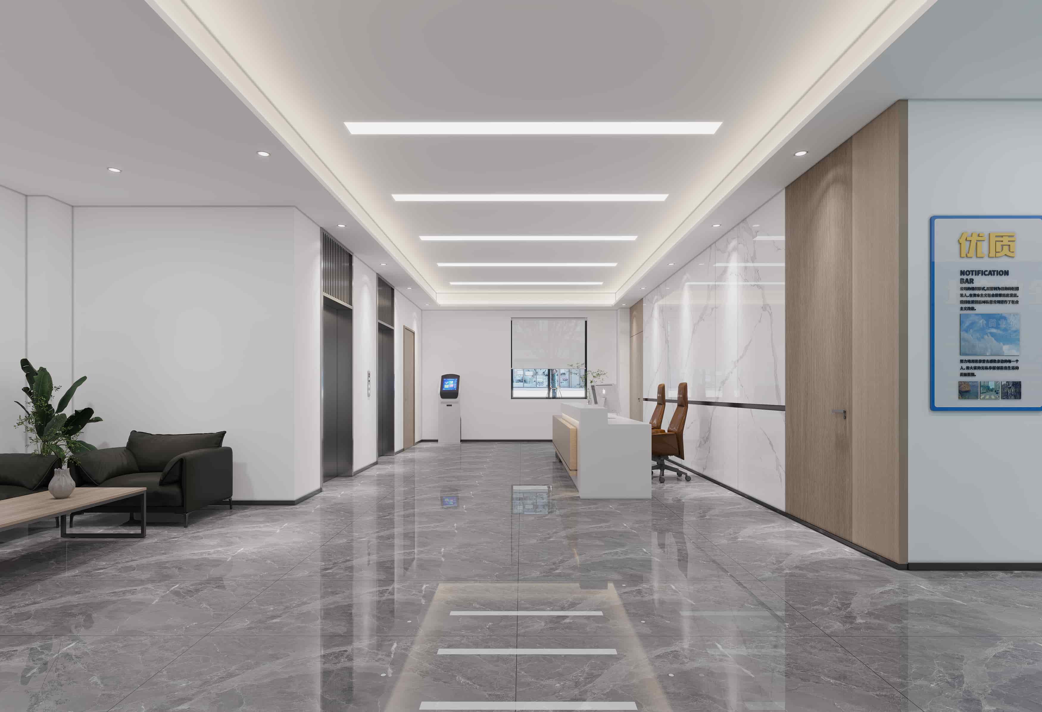 公共區(qū)域,前臺簡潔大氣,大理石與木質(zhì)元素結(jié)合;走廊明亮寬敞,燈帶照明舒適。