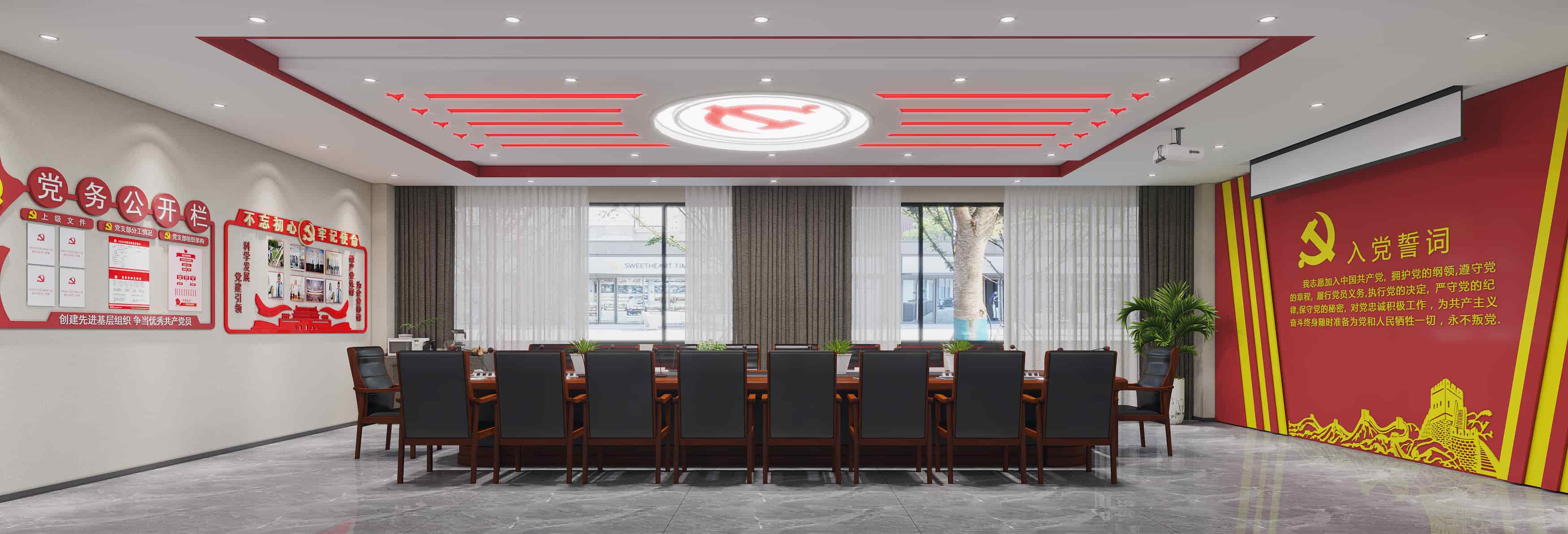 辦公區(qū),開放式空間布局合理,桌椅實用,采光良好;會議室各具特色,或具團隊氛圍,或顯黨建莊重。