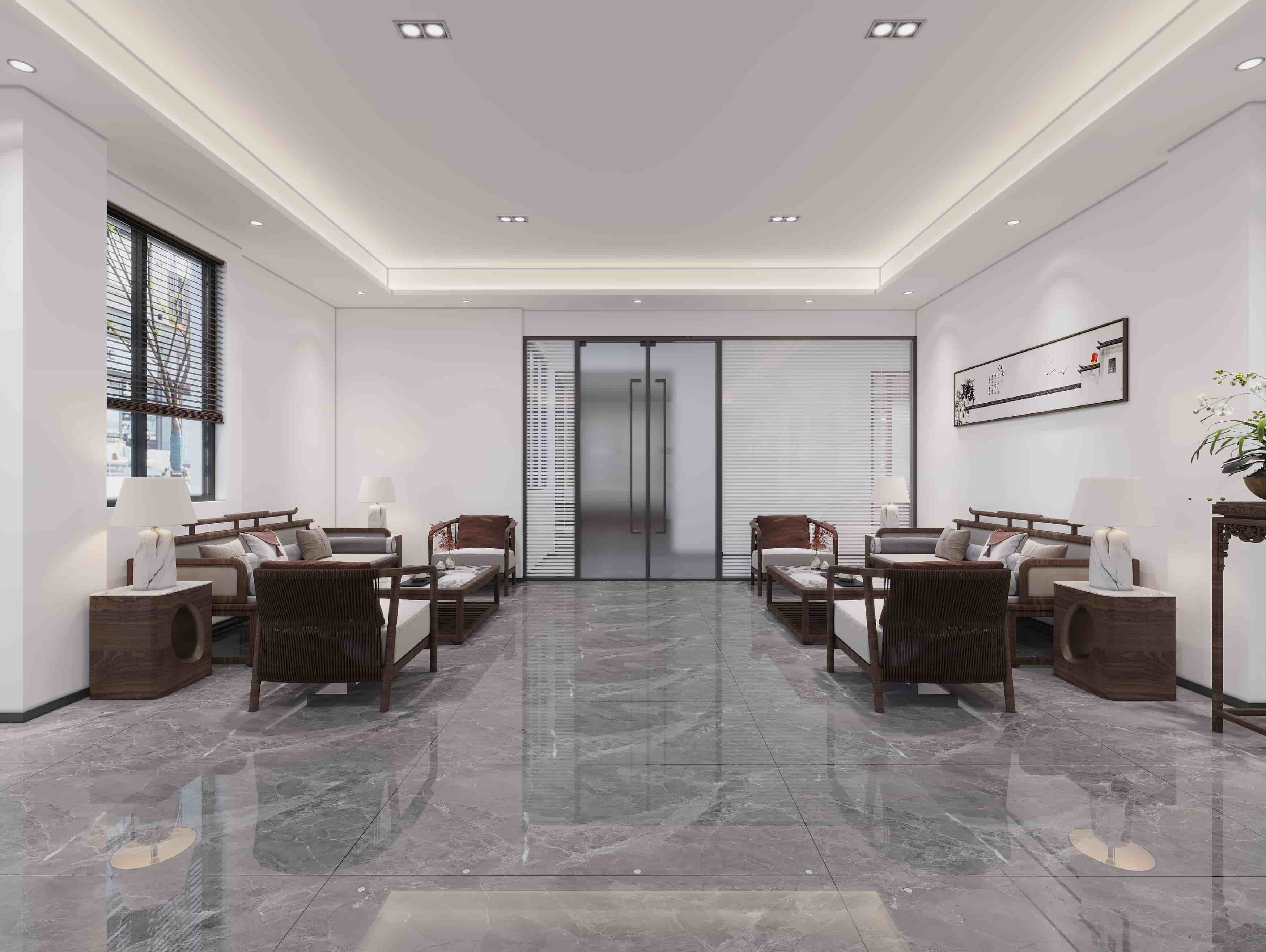 休閑接待區(qū),中式風(fēng)格典雅寧靜,新中式家具搭配字畫綠植;現(xiàn)代風(fēng)格時尚穩(wěn)重,黑白配色與藝術(shù)裝飾相得益彰。