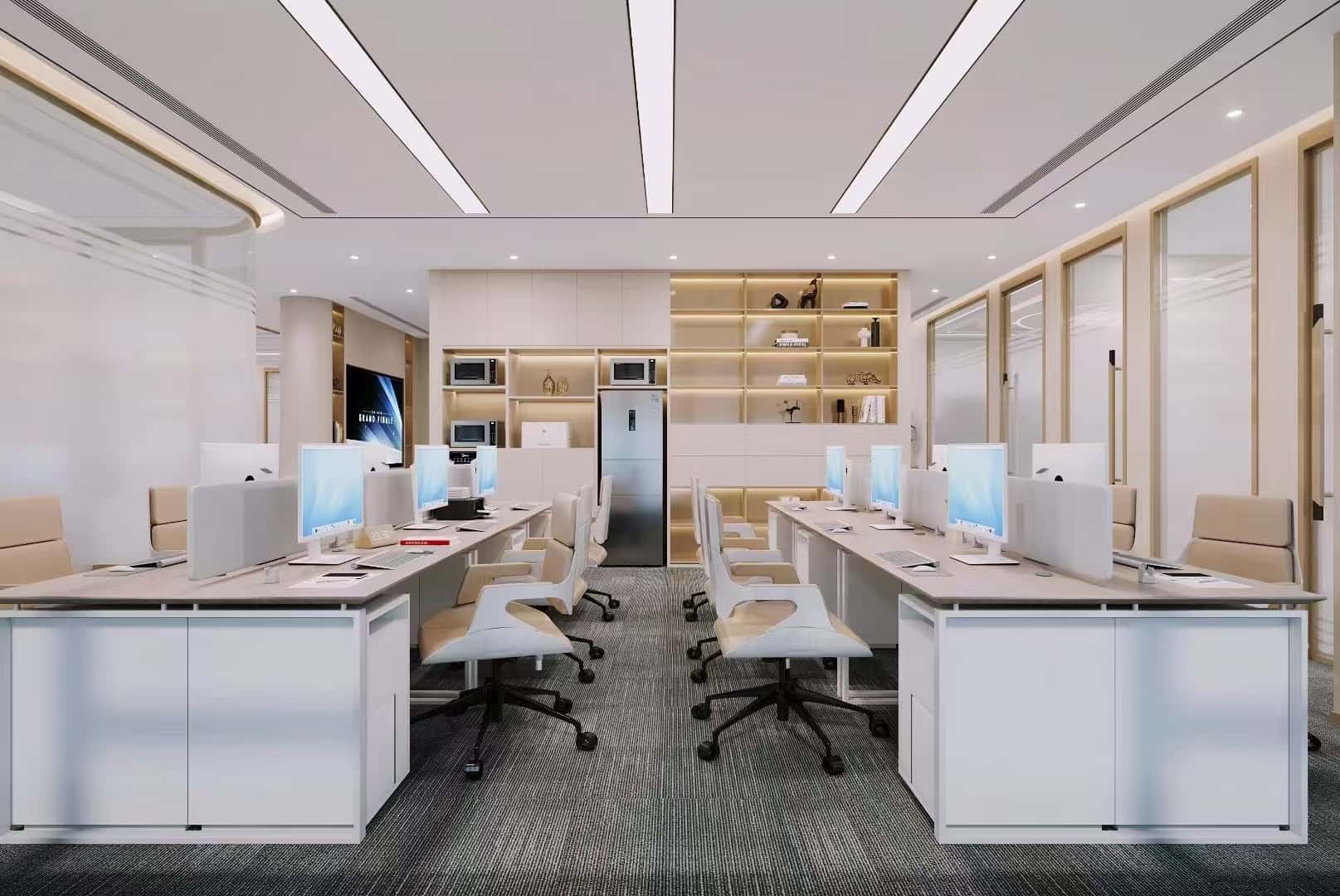 開(kāi)放式辦公區(qū)布局合理,辦公桌整齊排列,白色的辦公桌搭配米色與白色相間的辦公椅,簡(jiǎn)潔大方且舒適實(shí)用。天花板上的長(zhǎng)條形燈帶設(shè)計(jì),提供了均勻充足的照明,同時(shí)增強(qiáng)了空間的縱深感與現(xiàn)代感。