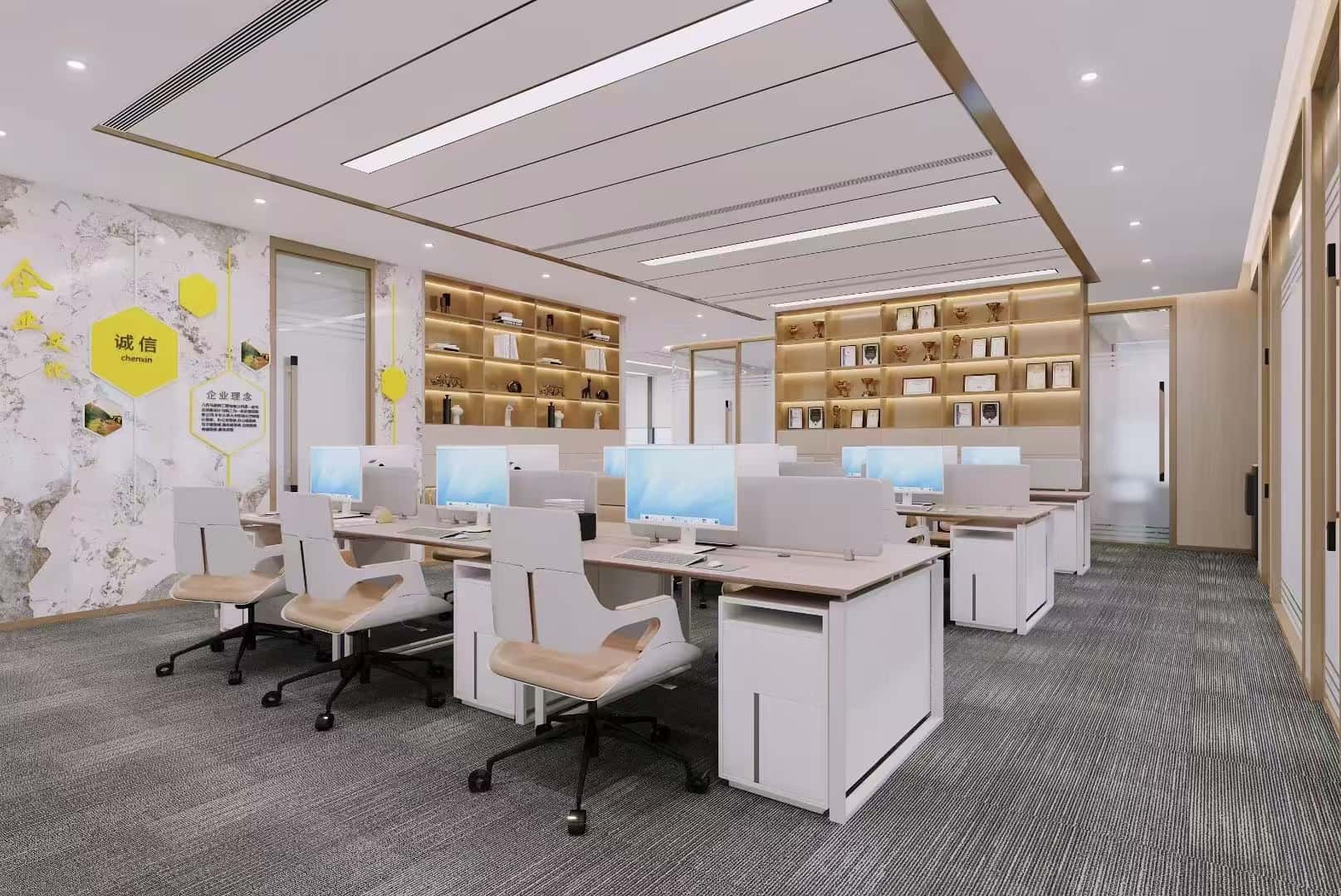 背景墻的設(shè)計(jì)別具一格,一側(cè)采用大理石紋理搭配黃色六邊形裝飾,展示企業(yè)理念,如 “誠(chéng)信” 等,既豐富了視覺(jué)效果,又傳遞了企業(yè)文化。另一側(cè)的木質(zhì)書(shū)架,內(nèi)嵌燈帶,陳列著書(shū)籍、裝飾品等,營(yíng)造出溫馨且富有文化氛圍的工作環(huán)境。
