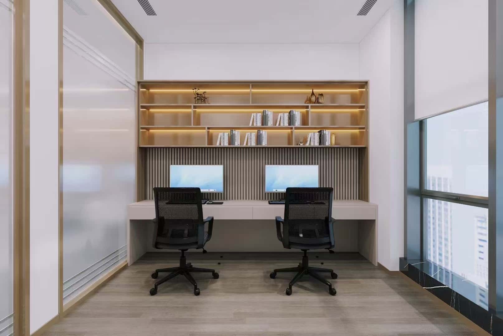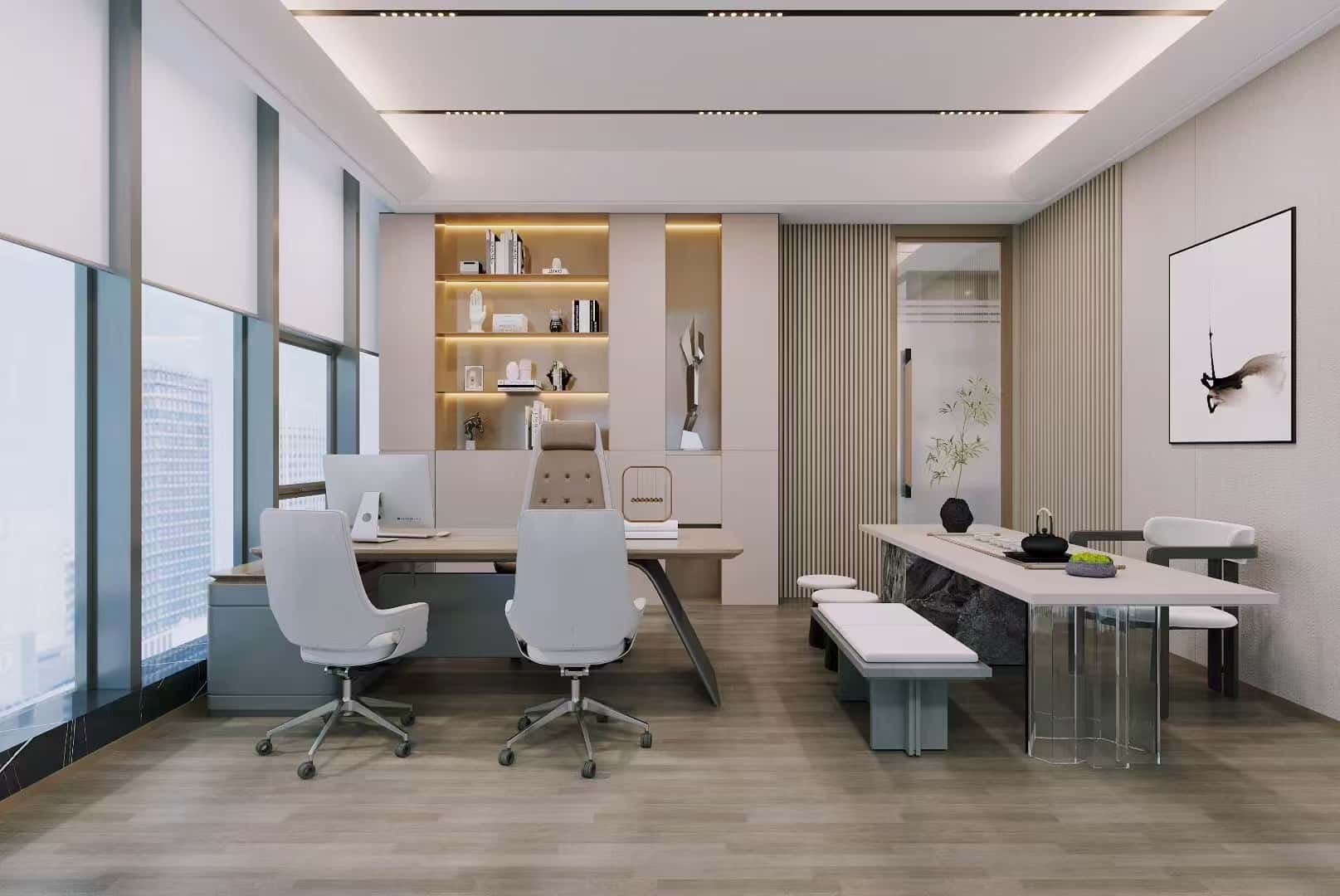 經(jīng)理辦公室寬敞明亮,大面積的落地窗引入充足的自然光線,同時(shí)可俯瞰城市景觀,視野開(kāi)闊,為辦公人員提供了舒適的視覺(jué)享受。