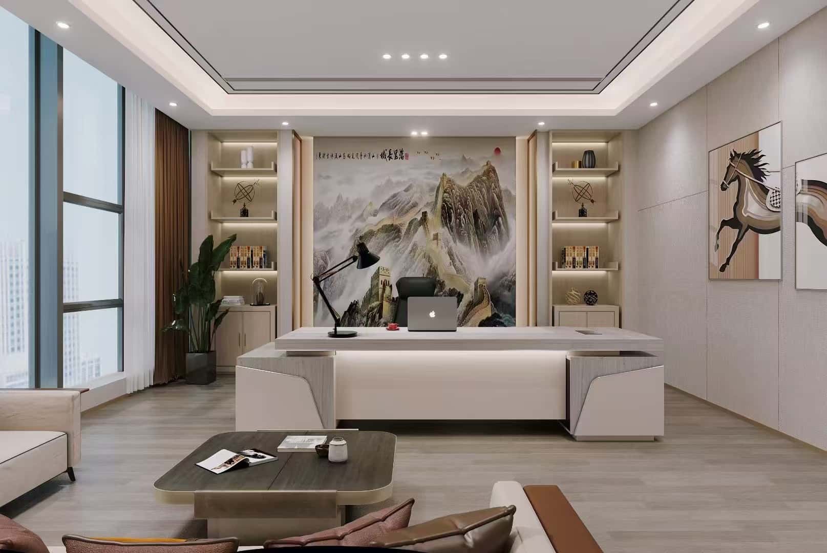 辦公家具選擇簡(jiǎn)約而富有設(shè)計(jì)感的款式,辦公桌、辦公椅及沙發(fā)等家具的顏色搭配和諧,營(yíng)造出舒適的辦公氛圍。書(shū)架上擺放的書(shū)籍、裝飾品等,豐富了空間的文化內(nèi)涵,展現(xiàn)出企業(yè)的品味與格調(diào)。部分辦公室內(nèi)的背景墻裝飾有大幅山水畫(huà)或藝術(shù)畫(huà)作,如長(zhǎng)城畫(huà)作、駿馬畫(huà)作等,增添了藝術(shù)氣息與文化底蘊(yùn),體現(xiàn)了領(lǐng)導(dǎo)的品味與企業(yè)的文化內(nèi)涵。