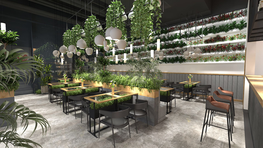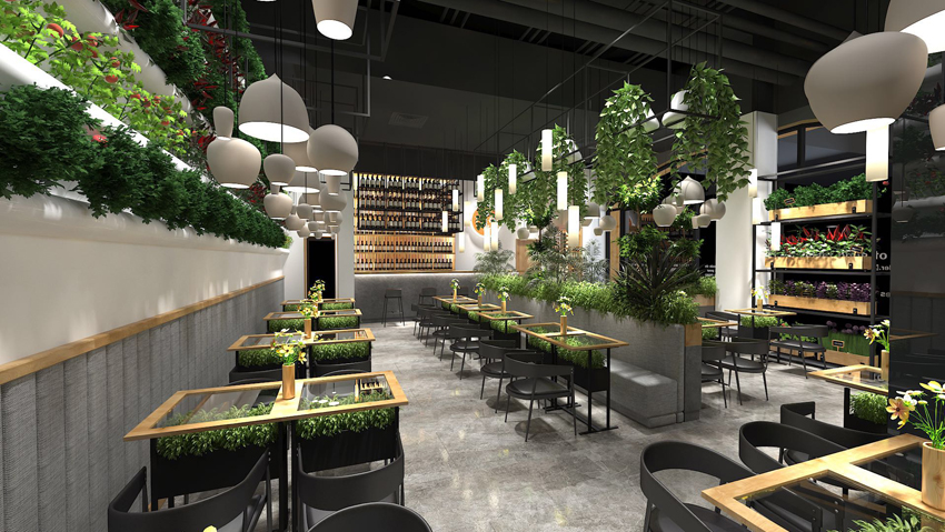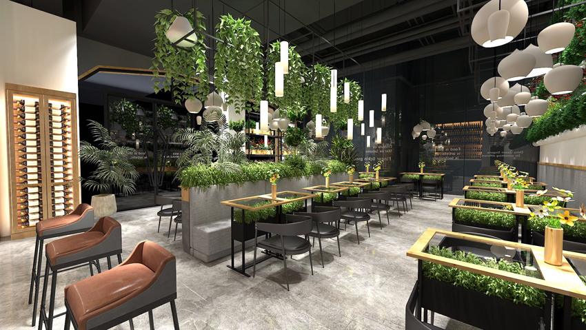 踏入室內(nèi),仿佛置身于一個(gè)綠色的植物世界。墻面和天花板上布滿了各式各樣的綠植,垂直綠化墻不僅增加了空間的層次感,還起到了美化環(huán)境和凈化空氣的作用。綠植的選擇豐富多樣,有高大的棕櫚類植物,也有小巧的盆栽,營(yíng)造出一種生機(jī)勃勃的自然氛圍。