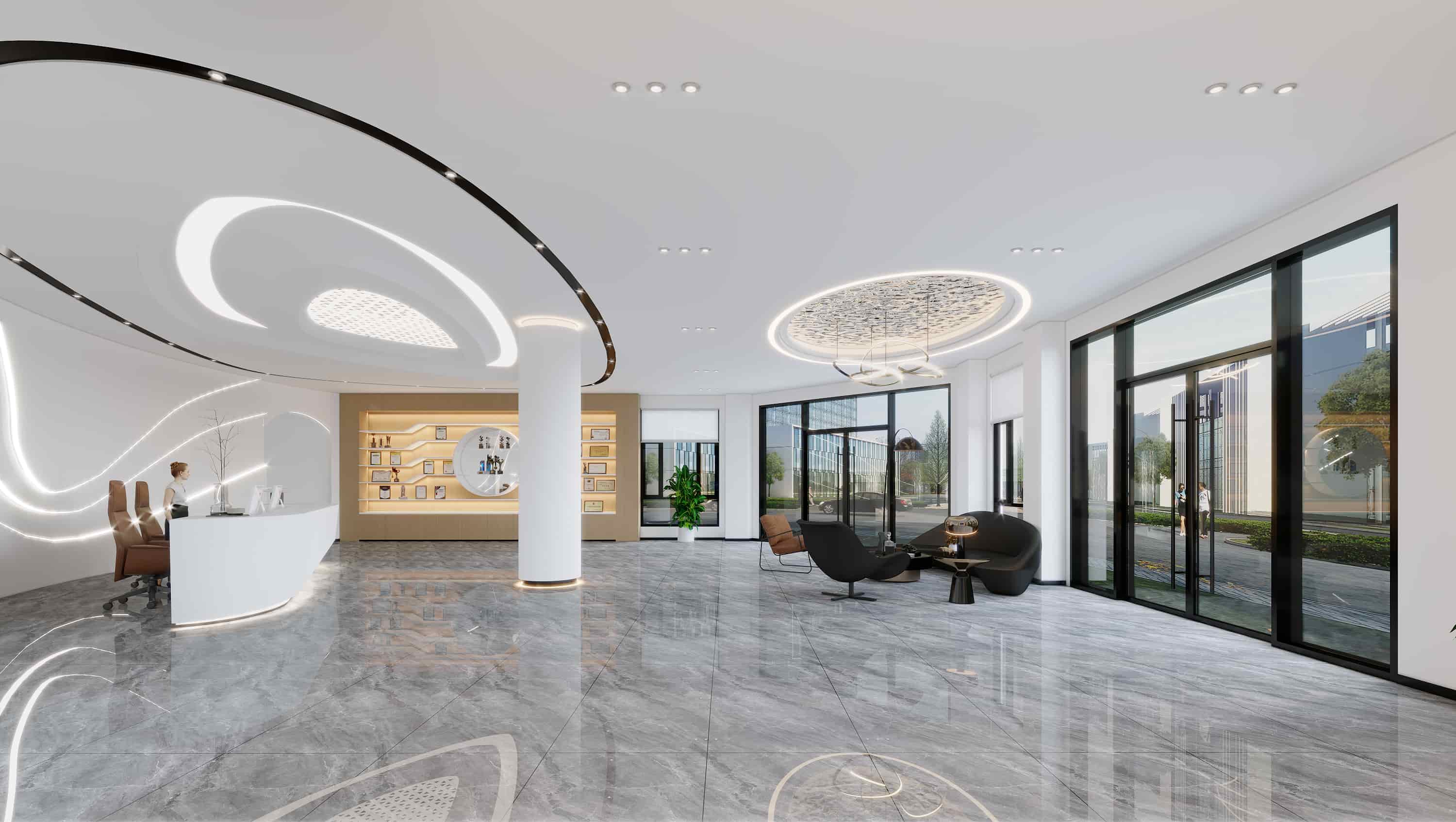 大廳:以白色為主色調(diào),搭配灰色大理石地面,營(yíng)造出簡(jiǎn)潔大氣的氛圍。天花板上獨(dú)特的弧形燈帶設(shè)計(jì),線條流暢,宛如藝術(shù)裝置,增添了空間的科技感與靈動(dòng)性。圓形吊燈精致美觀,與整體風(fēng)格相得益彰。大面積的落地窗引入充足自然光線,使空間更加明亮通透。接待臺(tái)造型簡(jiǎn)約現(xiàn)代,白色外觀干凈利落,后方的展示墻可用于陳列企業(yè)榮譽(yù)或產(chǎn)品,提升企業(yè)形象。休息區(qū)的黑色沙發(fā)與棕色座椅,為來(lái)訪者提供了舒適的等候空間。