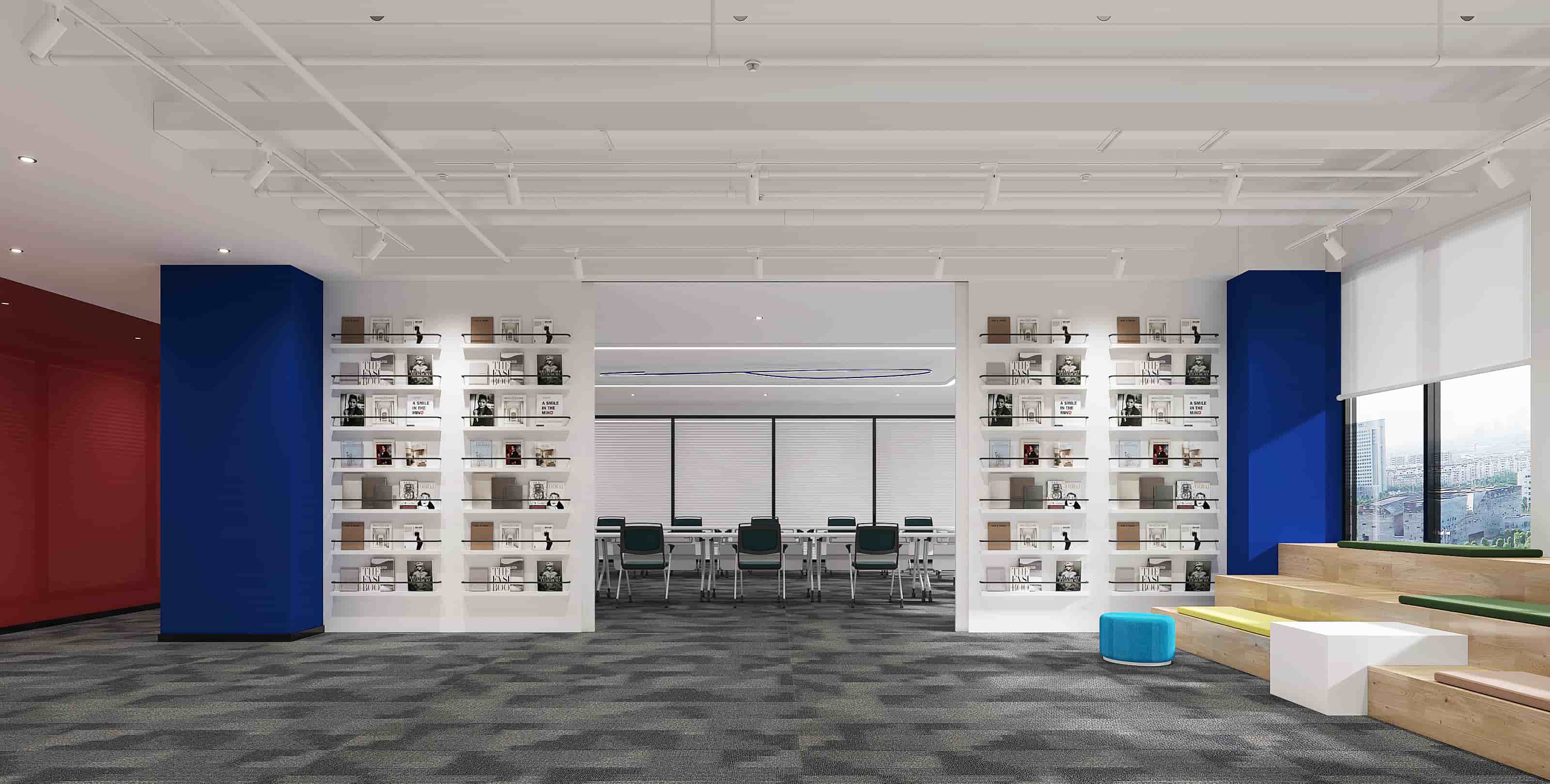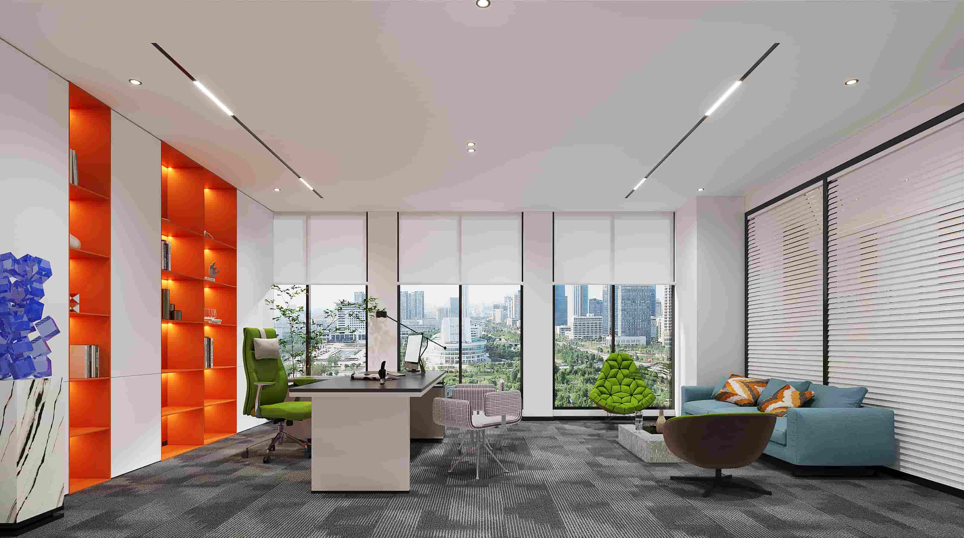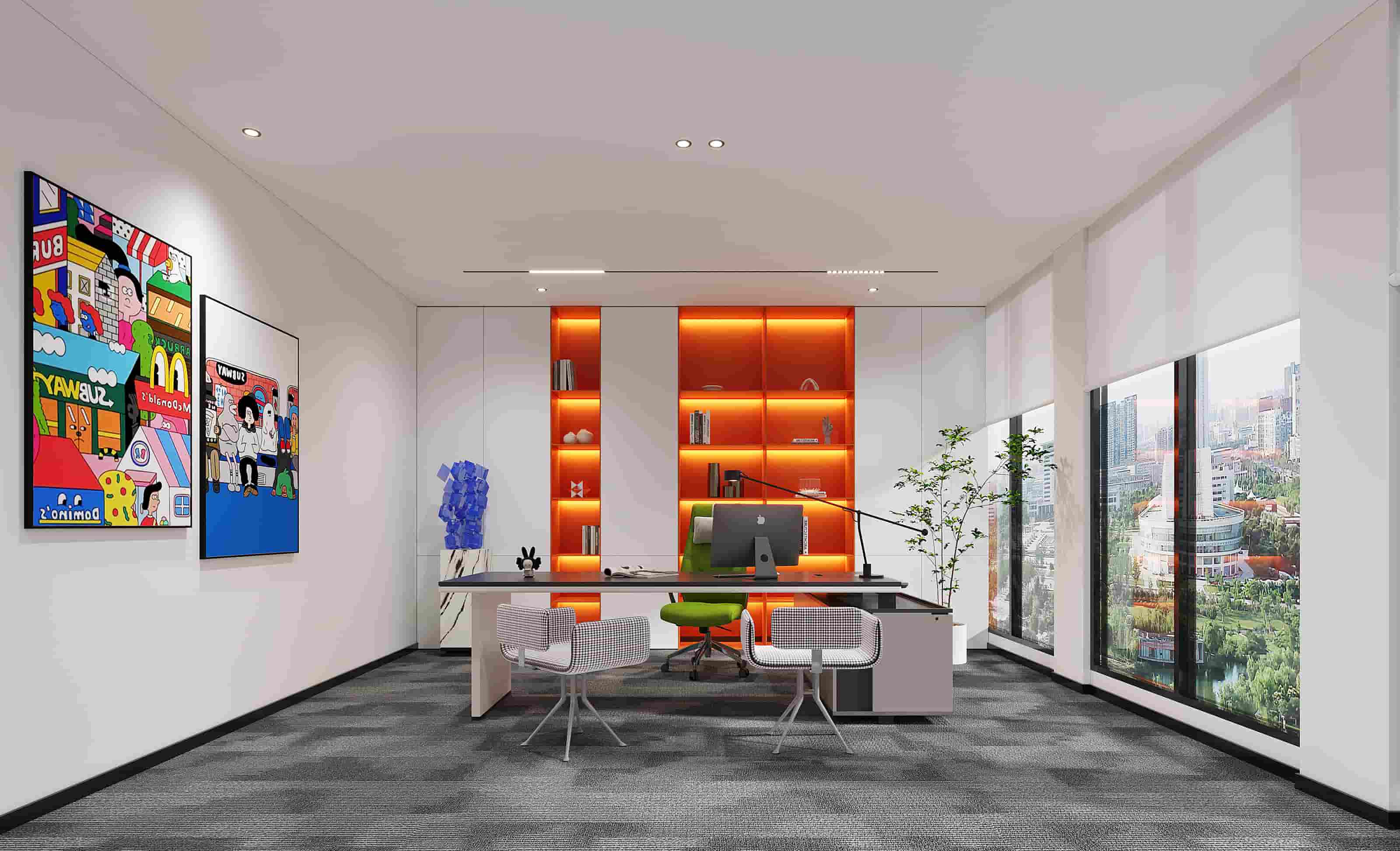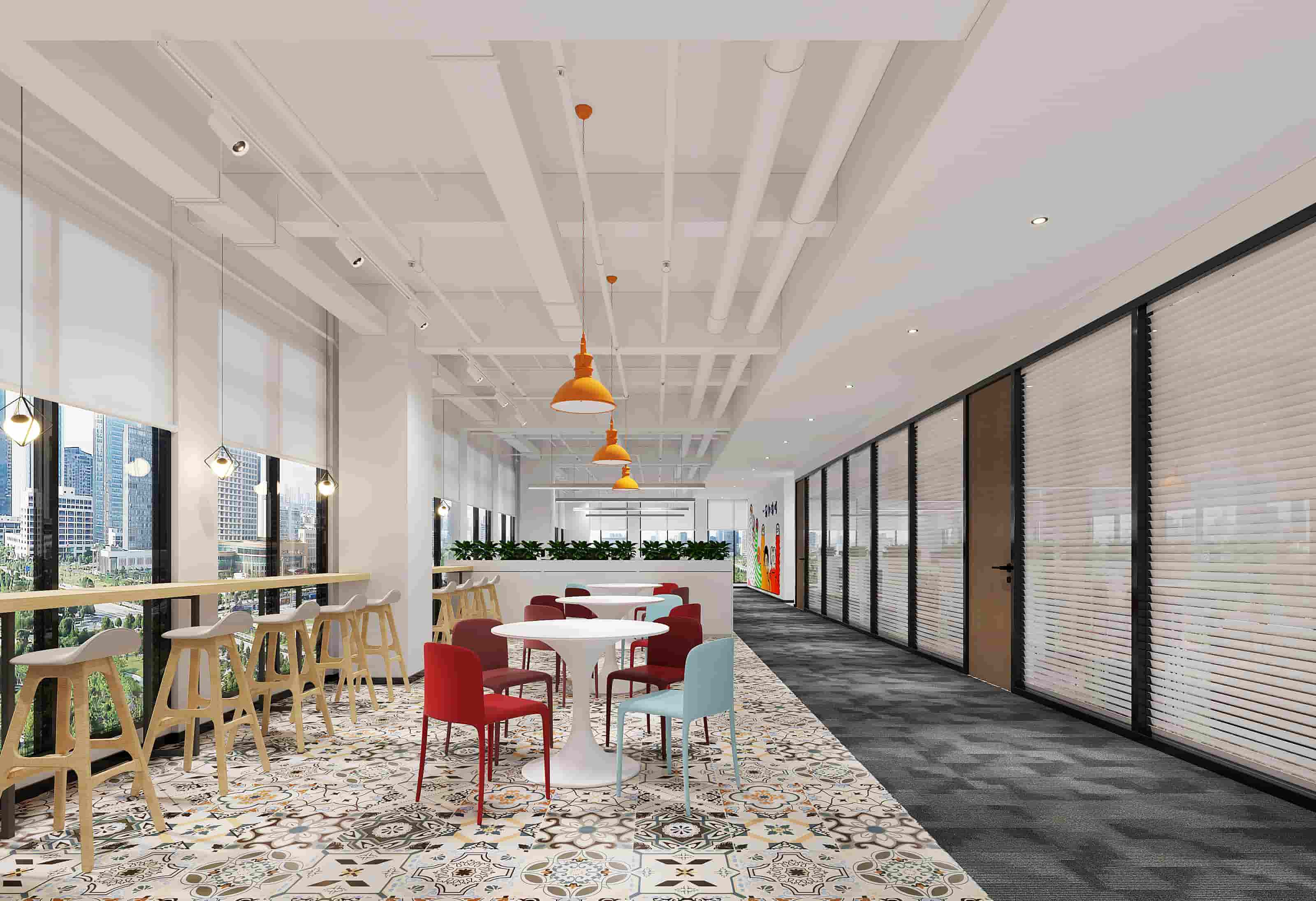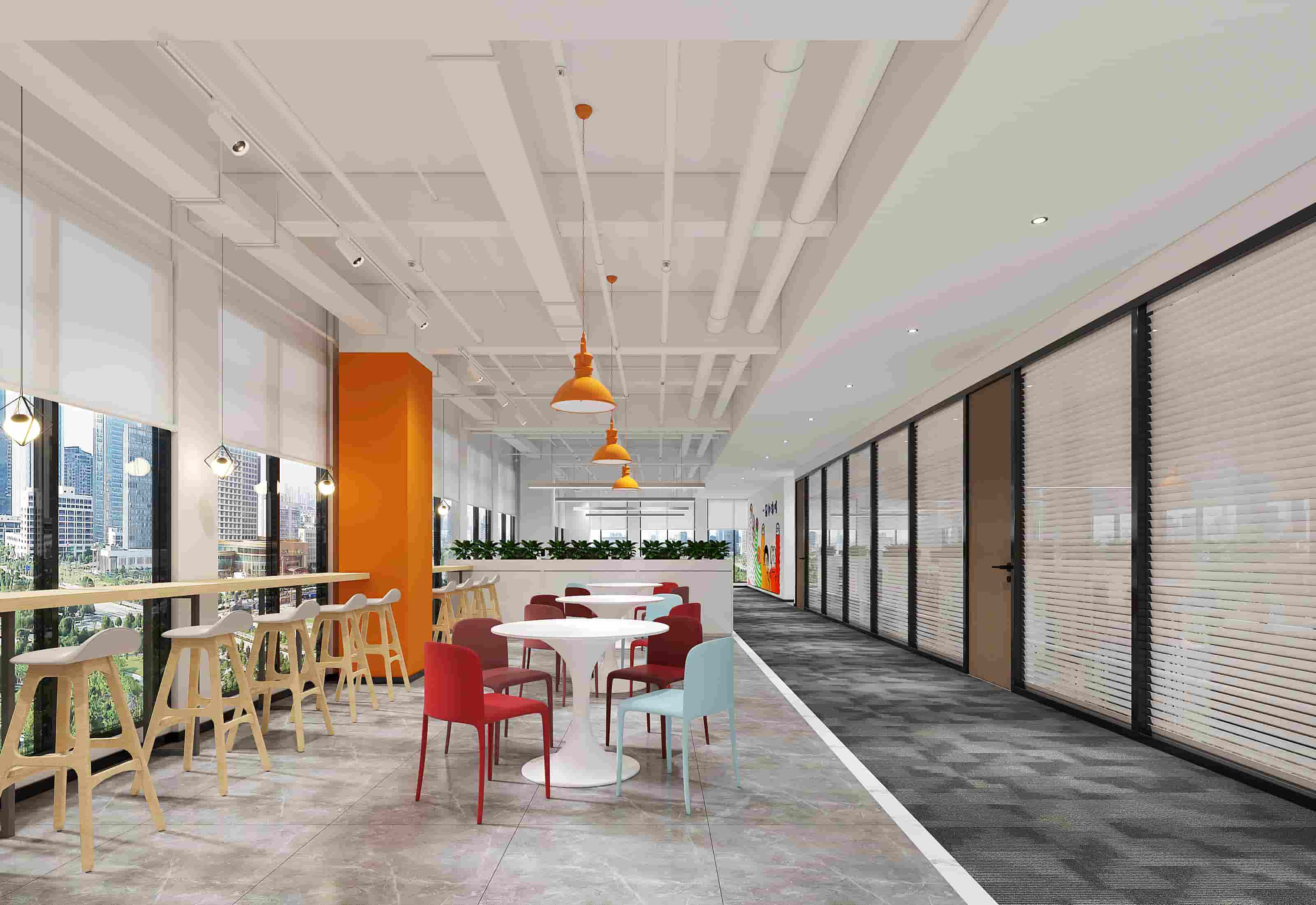 休閑區(qū)以白色為主調(diào),搭配橙色立柱與多彩家具,營造輕松氛圍,落地窗引入充足光線,窗外景色宜人。會(huì)議室兩側(cè)書架陳列書籍,增添文化氣息,藍(lán)色立柱與紅色墻面形成視覺沖擊。階梯區(qū)木質(zhì)階梯結(jié)合彩色坐墊,背景墻的城市景觀壁畫別具一格。辦公室內(nèi)色彩鮮艷的裝飾與簡(jiǎn)潔的辦公家具相得益彰,綠植點(diǎn)綴生機(jī)。各處燈光設(shè)計(jì)柔和,照亮空間同時(shí)提升舒適度,旨在打造一個(gè)功能多樣、舒適且充滿創(chuàng)意的辦公環(huán)境。