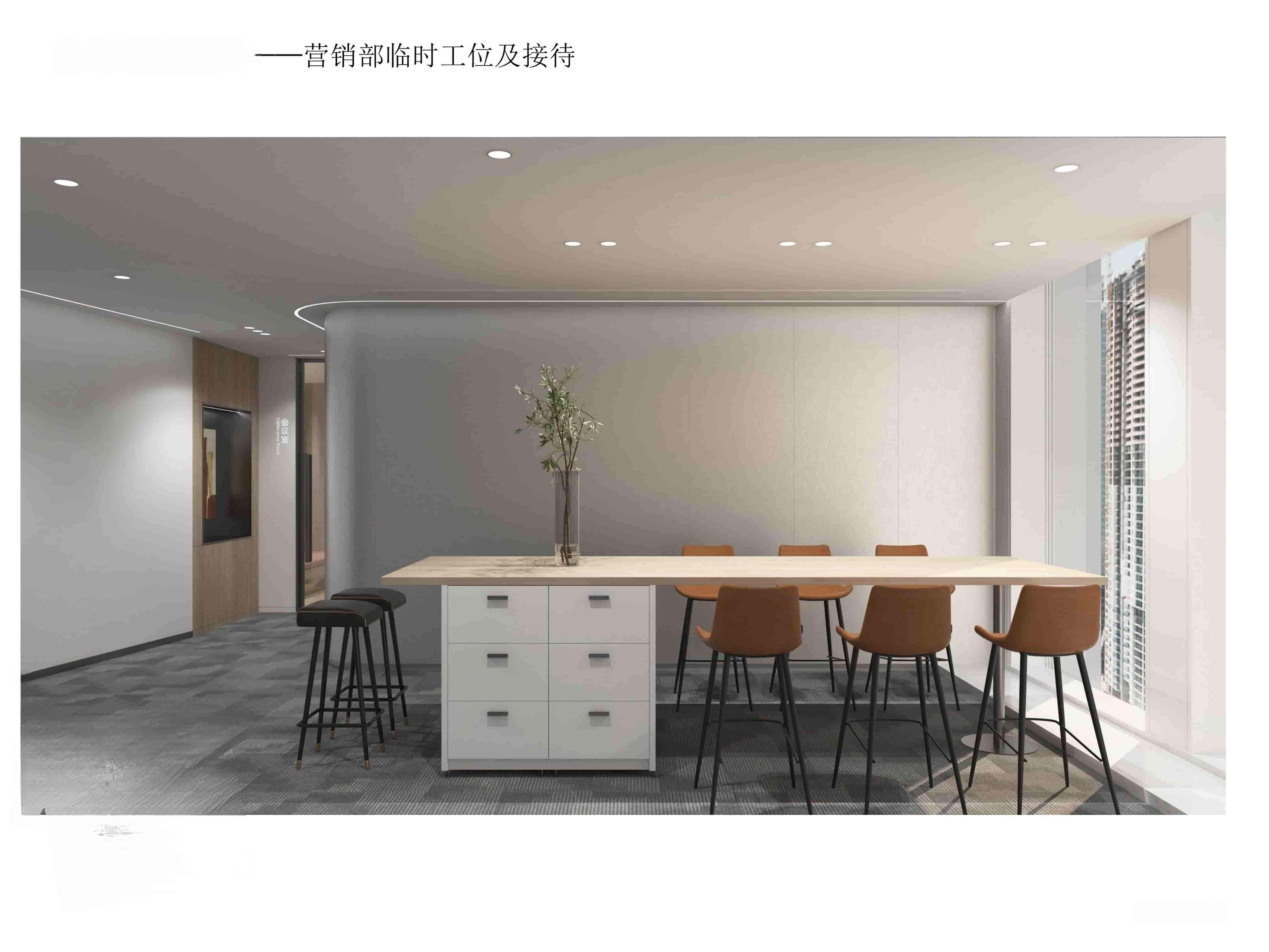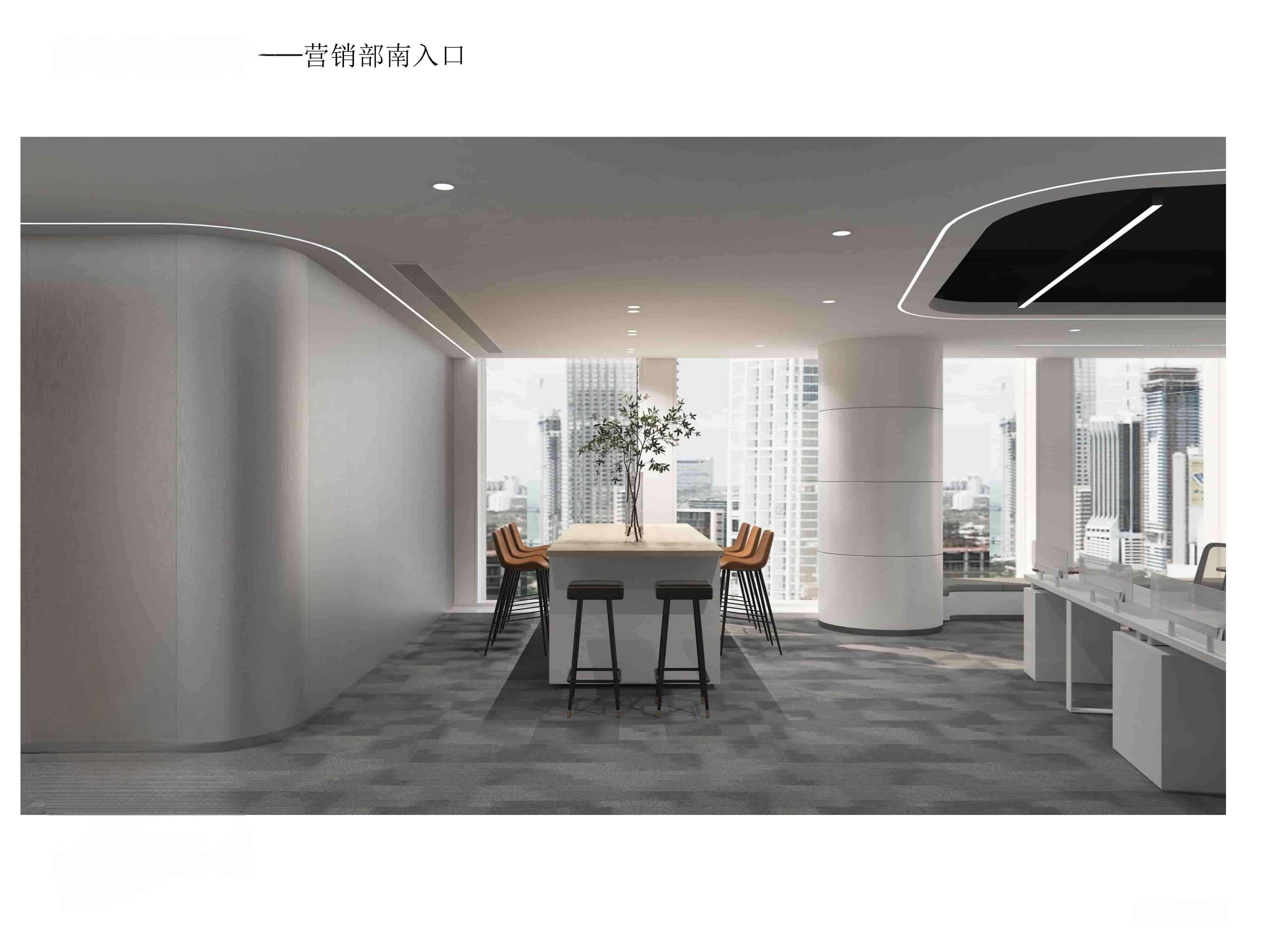 本設(shè)計(jì)為公司辦公區(qū)域,整體風(fēng)格簡(jiǎn)約現(xiàn)代。營(yíng)銷(xiāo)部以白色為主色調(diào),搭配灰色地毯,營(yíng)造簡(jiǎn)潔明亮氛圍。大面積辦公桌椅滿足多人辦公需求,天花板獨(dú)特的黑色區(qū)域與白色燈帶設(shè)計(jì),增添空間層次感與科技感。南入口處設(shè)置長(zhǎng)桌與舒適座椅,兼具臨時(shí)工位與接待功能,窗外城市景觀引入自然光線與開(kāi)闊視野。臨時(shí)工位及接待區(qū)同樣簡(jiǎn)潔實(shí)用,綠植點(diǎn)綴增添生機(jī)與活力。材質(zhì)選用環(huán)保耐用,燈光設(shè)計(jì)柔和明亮,旨在打造一個(gè)舒適、高效且富有活力的辦公環(huán)境,提升員工工作體驗(yàn)與企業(yè)形象。