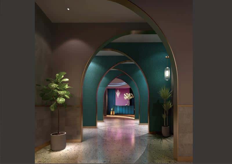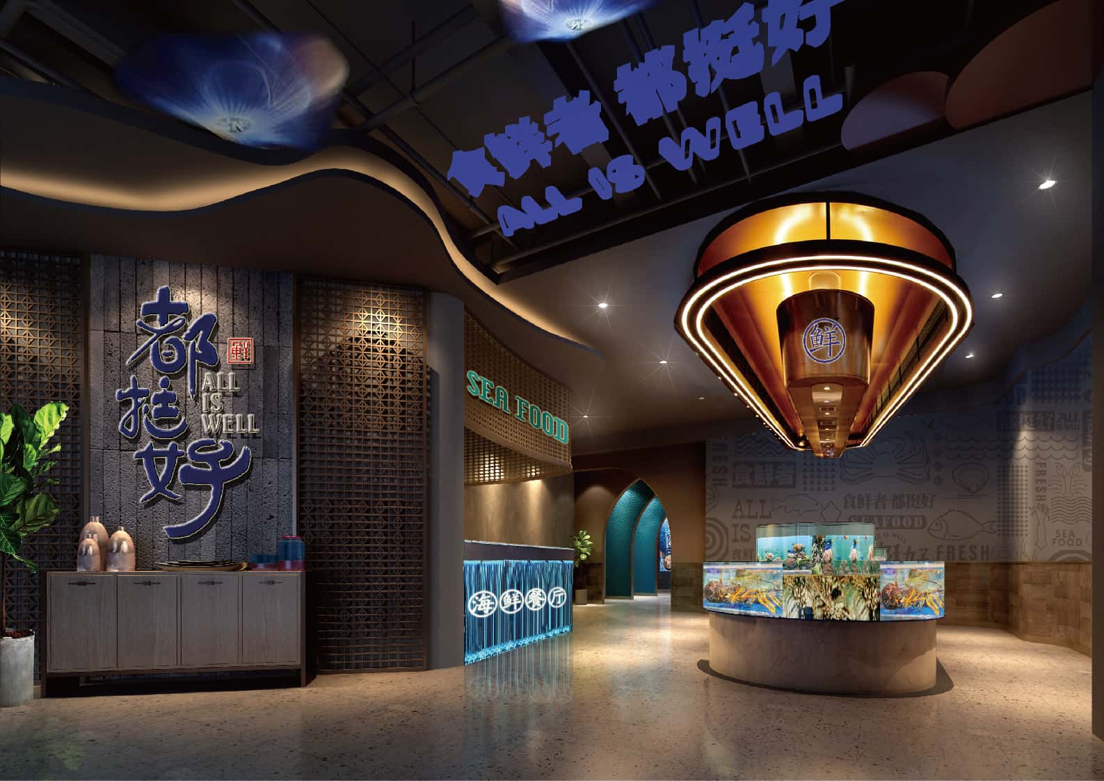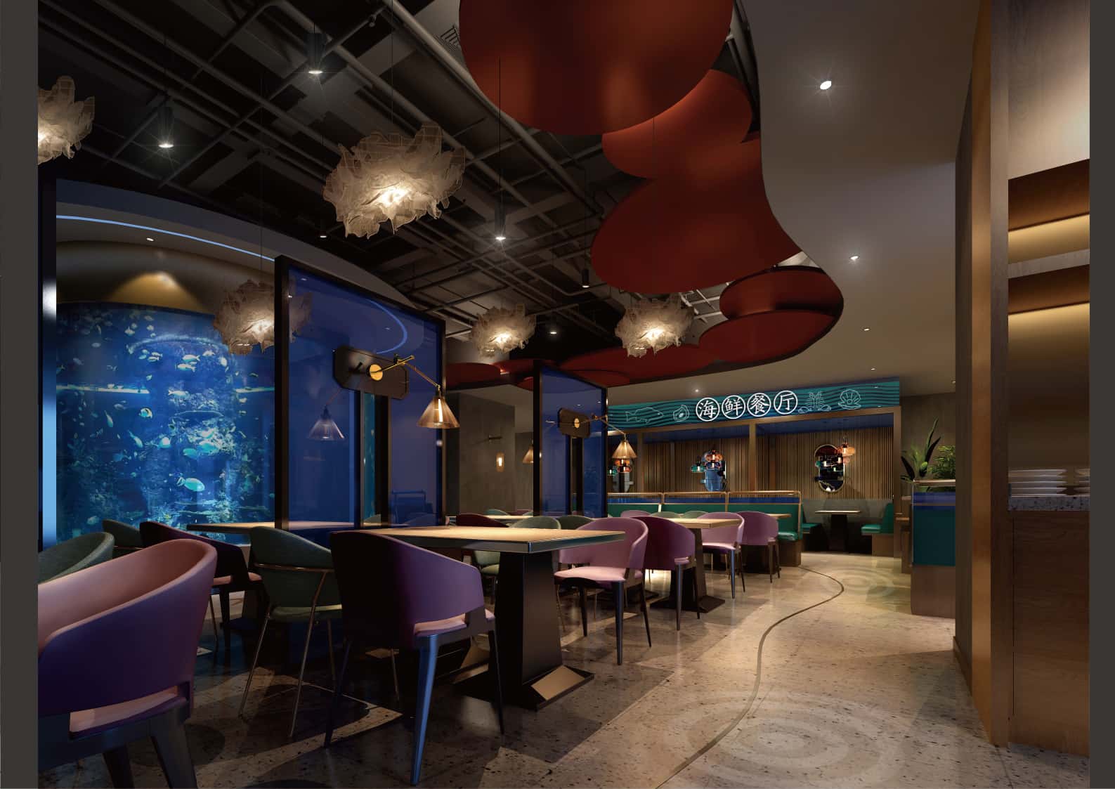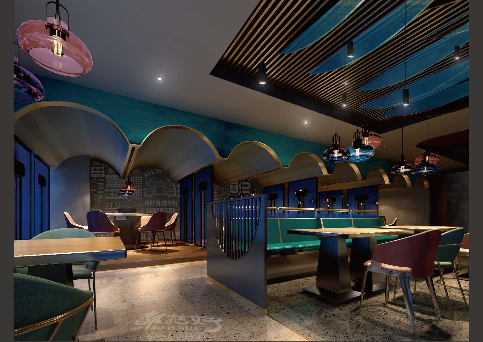 室內(nèi),天花板的波浪造型、墻面的海洋風(fēng)格裝飾以及地面的魚(yú)形圖案,處處呼應(yīng)海洋主題。燈光設(shè)計(jì)巧妙,柔和且富有層次感,增強(qiáng)空間的立體感與氛圍感。桌椅色彩搭配和諧,為顧客提供舒適的就餐環(huán)境。整體設(shè)計(jì)將海洋元素與現(xiàn)代風(fēng)格相結(jié)合,打造出一個(gè)既時(shí)尚又充滿海洋氣息的海鮮餐廳,讓顧客仿佛置身于海底世界,享受美食與美景。