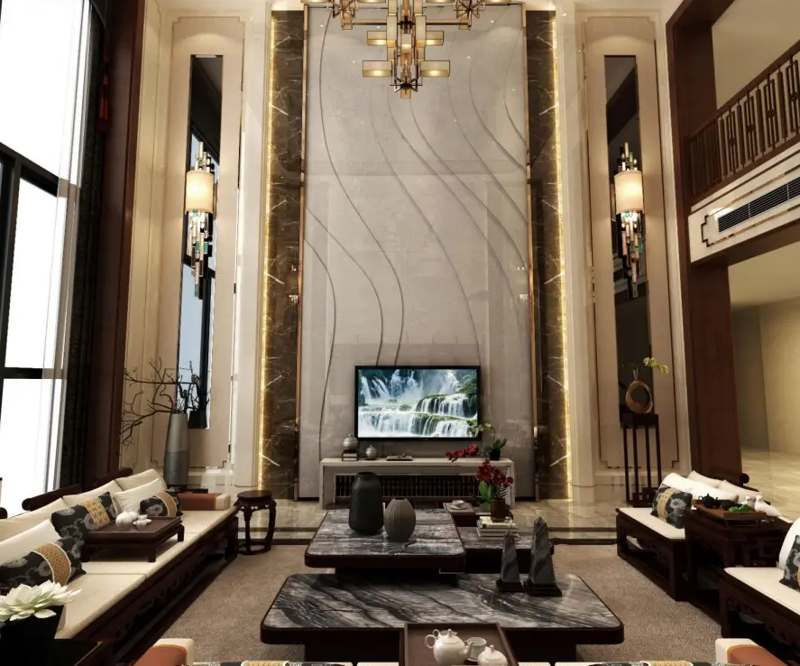 客廳區(qū)域,挑高設(shè)計搭配大理石背景墻與中式吊燈,盡顯大氣與典雅。中式家具與現(xiàn)代元素融合,營造舒適氛圍。