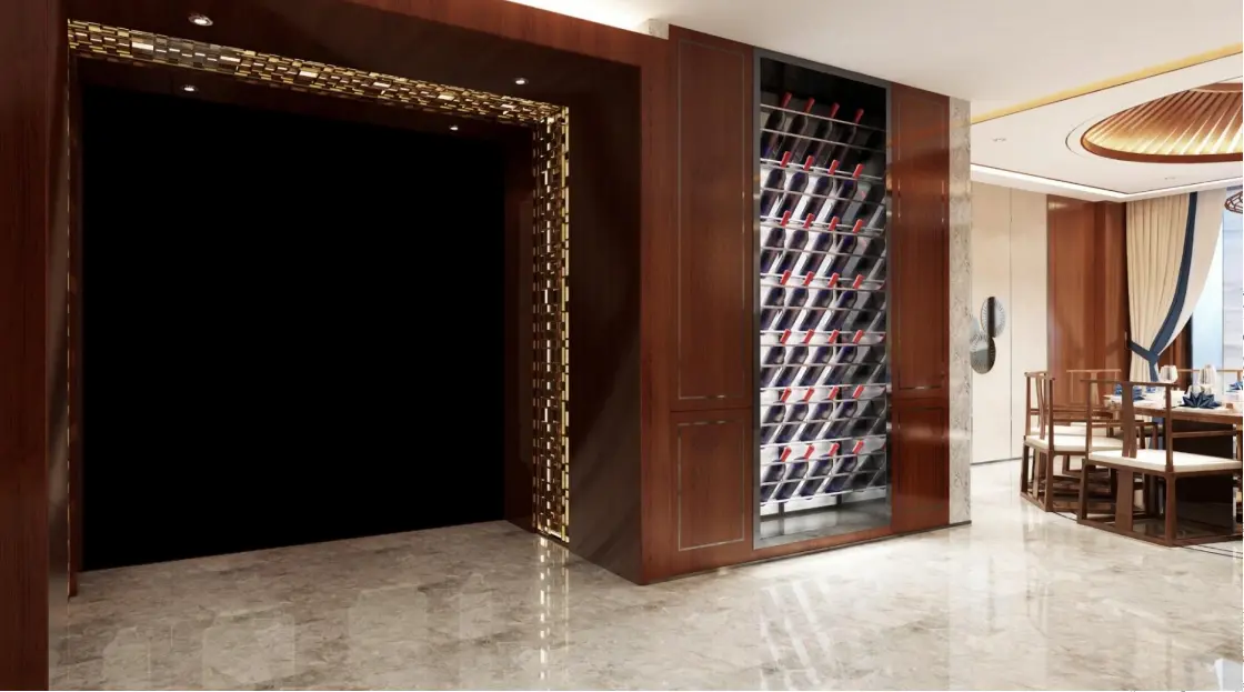 餐廳,圓形餐桌搭配中式餐椅,酒柜設(shè)計獨特,墻面裝飾畫增添藝術(shù)氣息,采光良好,營造溫馨就餐環(huán)境。