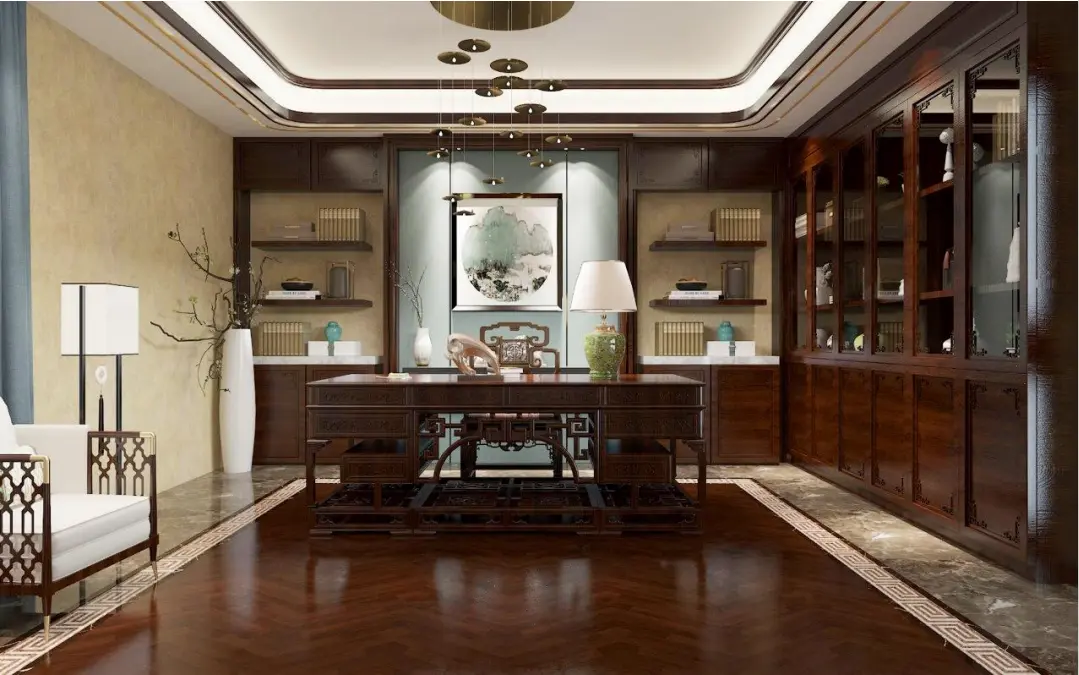 書房,深色木質(zhì)家具古樸莊重,書架陳列豐富,搭配中式燈具與裝飾畫,營造靜謐的學(xué)習(xí)與工作氛圍。