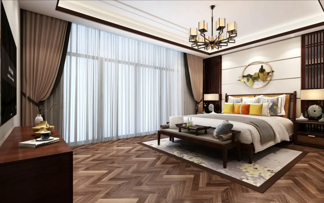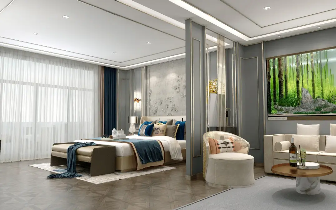 臥室,材質(zhì)多樣,木地板、大理石等搭配和諧,軟裝色彩豐富,床品舒適,燈光設(shè)計柔和,營造出溫馨舒適的休憩空間。