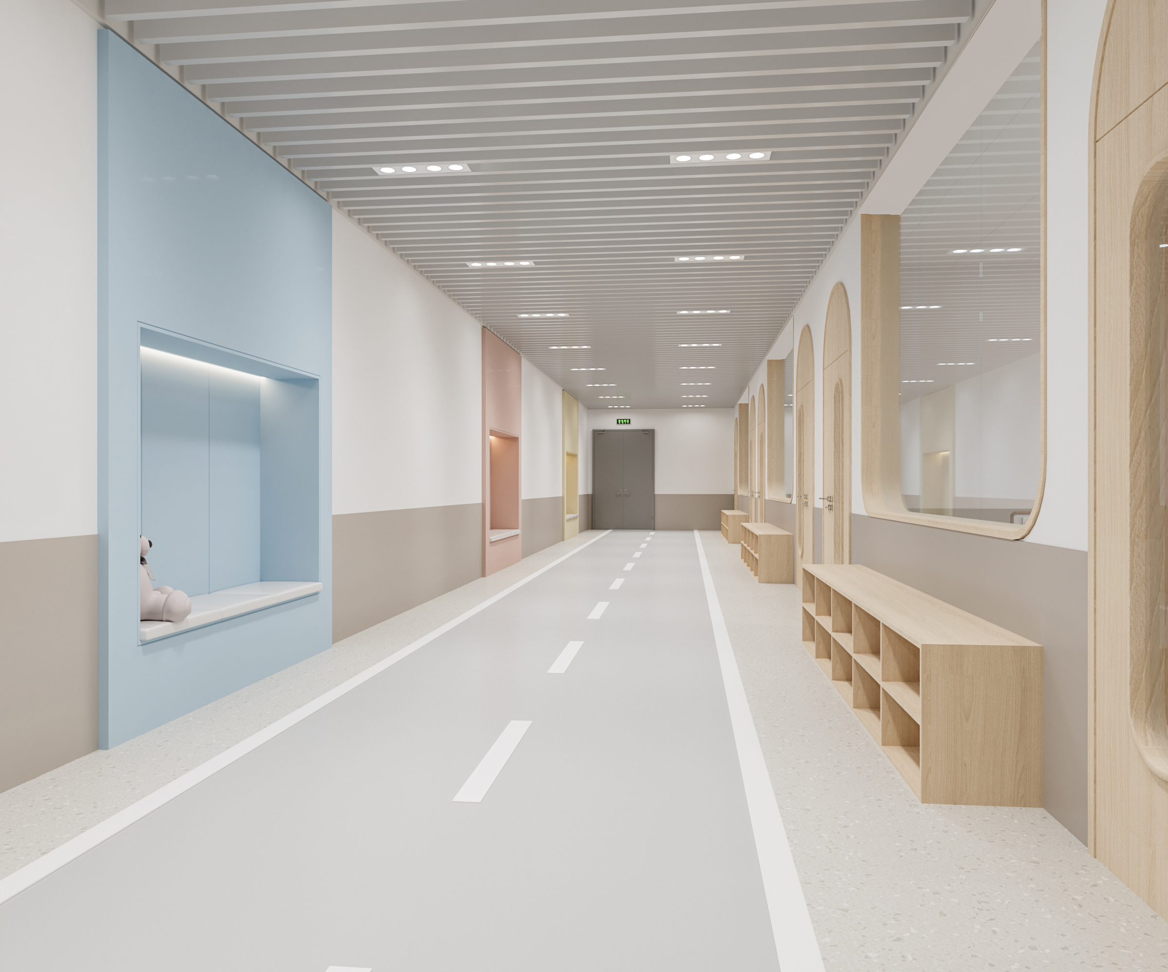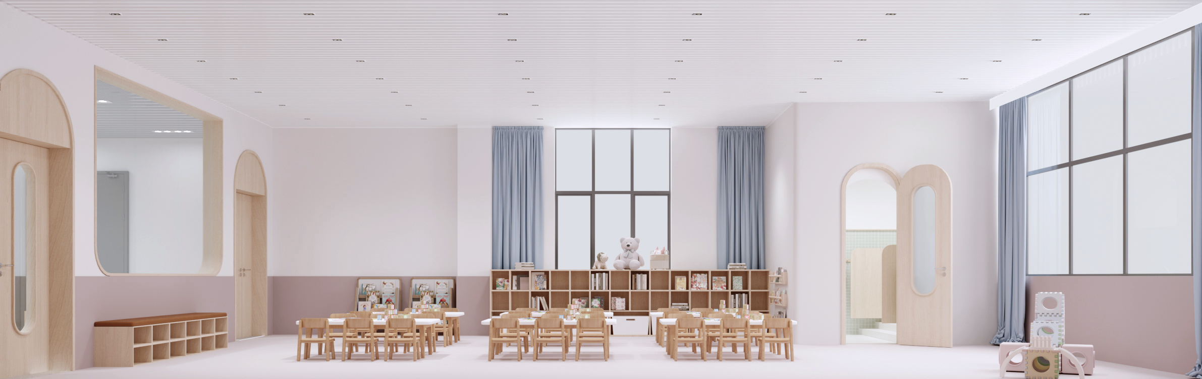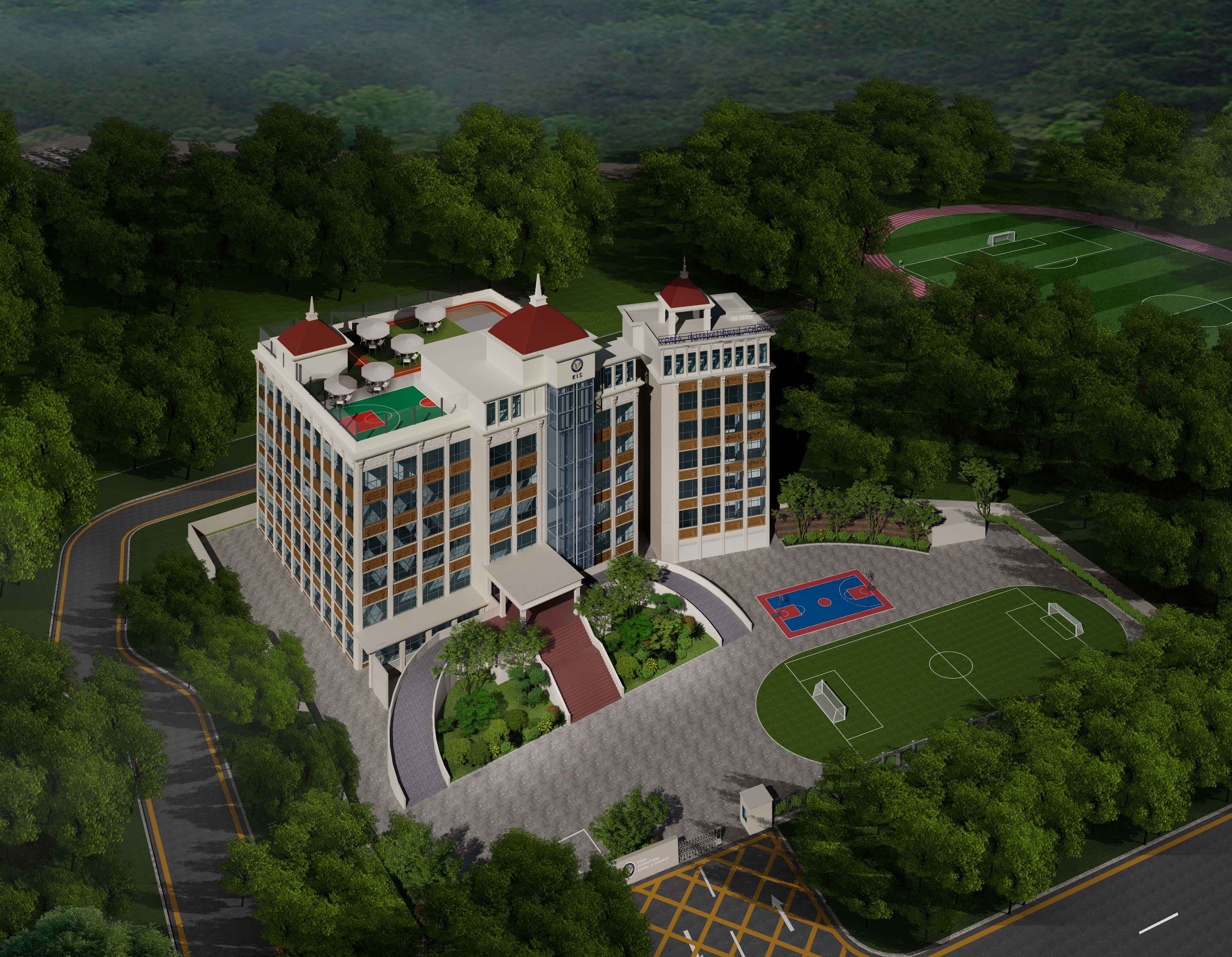 該學(xué)校設(shè)計(jì)圍繞 “助力成長(zhǎng),融合美學(xué)與功能” 展開(kāi)。外觀上,建筑風(fēng)格典雅,紅頂白墻搭配大面積玻璃,兼具美觀與采光性,周邊運(yùn)動(dòng)場(chǎng)地滿足體育教學(xué)。室內(nèi)大廳以大理石地面、木質(zhì)墻面營(yíng)造大氣莊重感,學(xué)校標(biāo)識(shí)醒目。幼兒活動(dòng)區(qū)采用柔和色調(diào)與圓潤(rùn)造型,搭配童趣設(shè)施,激發(fā)孩子探索欲。衛(wèi)生間用清新綠瓷磚與木質(zhì)隔斷,安全又舒適。運(yùn)動(dòng)場(chǎng)館色彩明快,專業(yè)場(chǎng)地設(shè)計(jì)保障運(yùn)動(dòng)需求。整體空間既符合教育功能,又通過(guò)溫馨、活力的設(shè)計(jì),為師生打造優(yōu)質(zhì)學(xué)習(xí)生活環(huán)境。