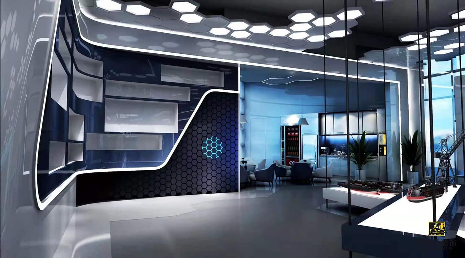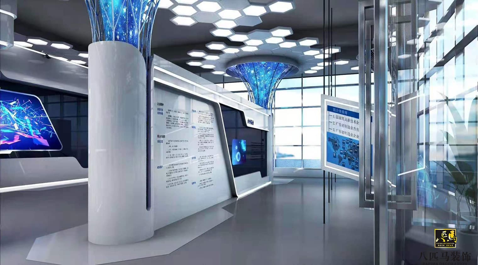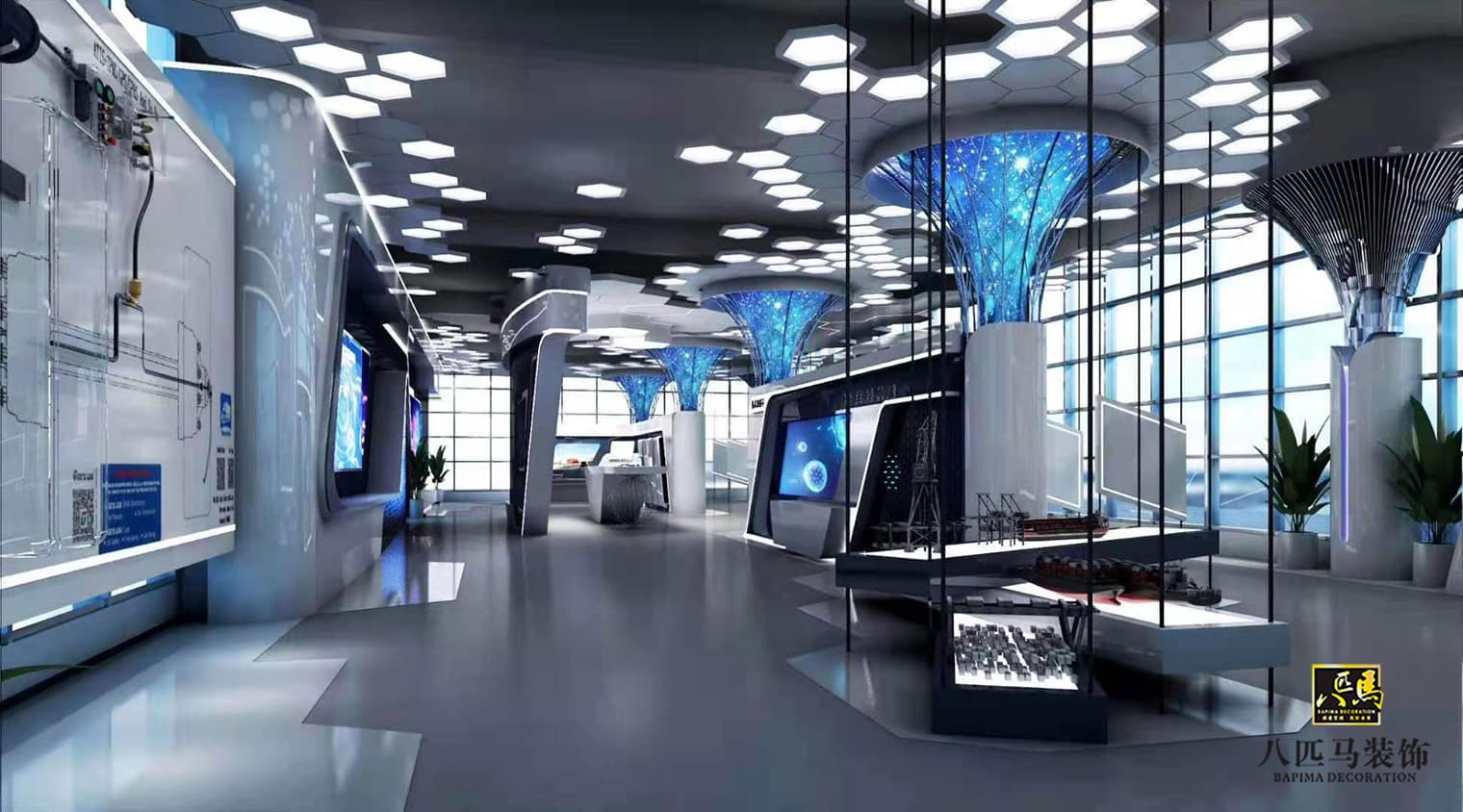 設(shè)計(jì)風(fēng)格:科技類型展廳空間,極具現(xiàn)代科技感,主色調(diào)采用富含科技感的藍(lán)白色,藍(lán)色理智寧靜,代表著水