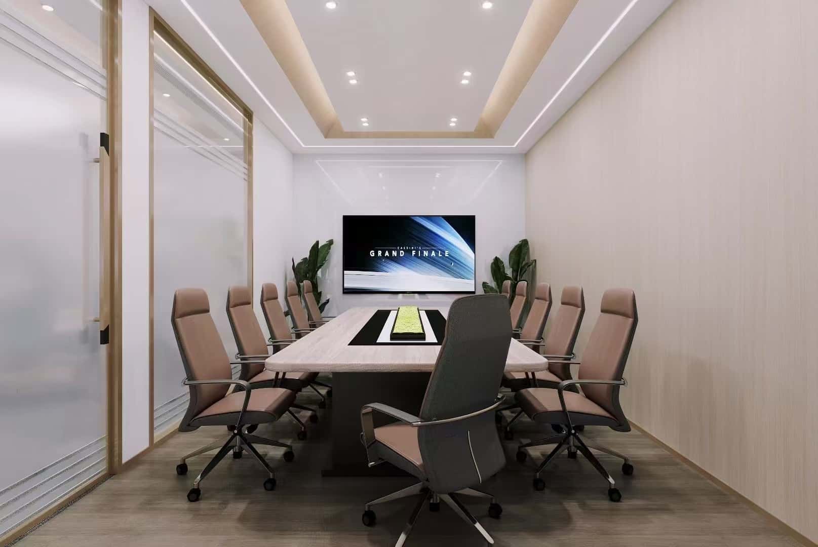 小型會(huì)議室空間緊湊而不失精致。墻面采用淺色材質(zhì),搭配木質(zhì)線條裝飾,營(yíng)造出溫馨舒適的氛圍。天花板的燈帶設(shè)計(jì)與墻面線條相呼應(yīng),增強(qiáng)了空間的整體感。會(huì)議桌選用淺色木質(zhì)材質(zhì),搭配棕色皮質(zhì)座椅,簡(jiǎn)潔大方且舒適,適合小型會(huì)議或討論。墻上的大屏幕可用于展示會(huì)議內(nèi)容,提升會(huì)議效率。
