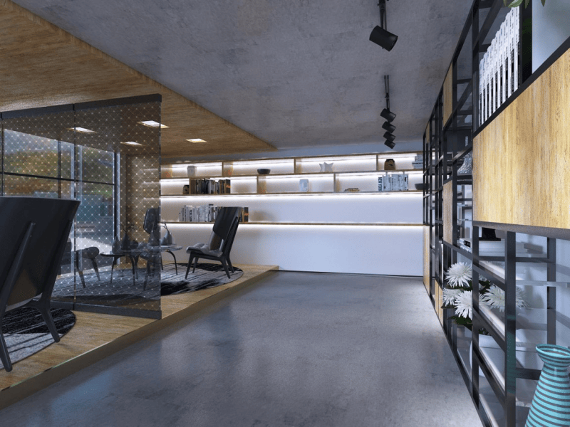 整體空間以黑白灰為主色調(diào),搭配木質(zhì)元素,營(yíng)造出簡(jiǎn)約而不失溫暖的氛圍。大面積的玻璃窗引入充足自然光,使空間更加明亮通透。